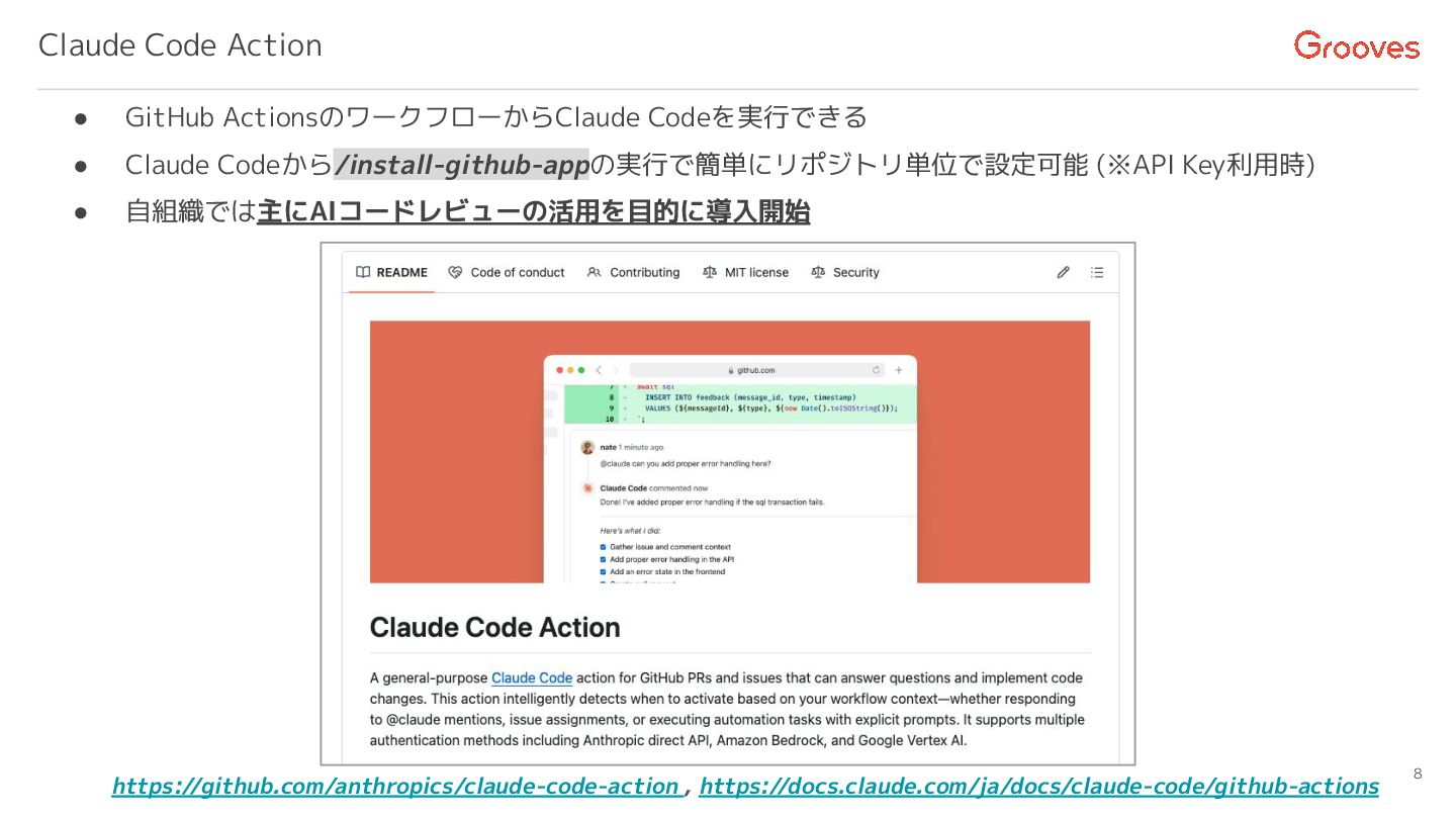 Codeから/install-github-appの実行で簡単にリポジトリ単位で設定可能 (※API Key利用時) • 自組織では主にAIコードレビューの活用を目的に導入開始 https://github.com/anthropics/claude-code-action , https://docs.claude.com/ja/docs/claude-code/github-actions