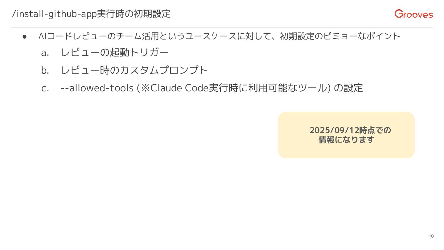 10 /install-github-app実行時の初期設定 • AIコードレビューのチーム活用というユースケースに対して、初期設定のビミョーなポイント a. レビューの起動トリガー b. レビュー時のカスタムプロンプト c. --allowed-tools