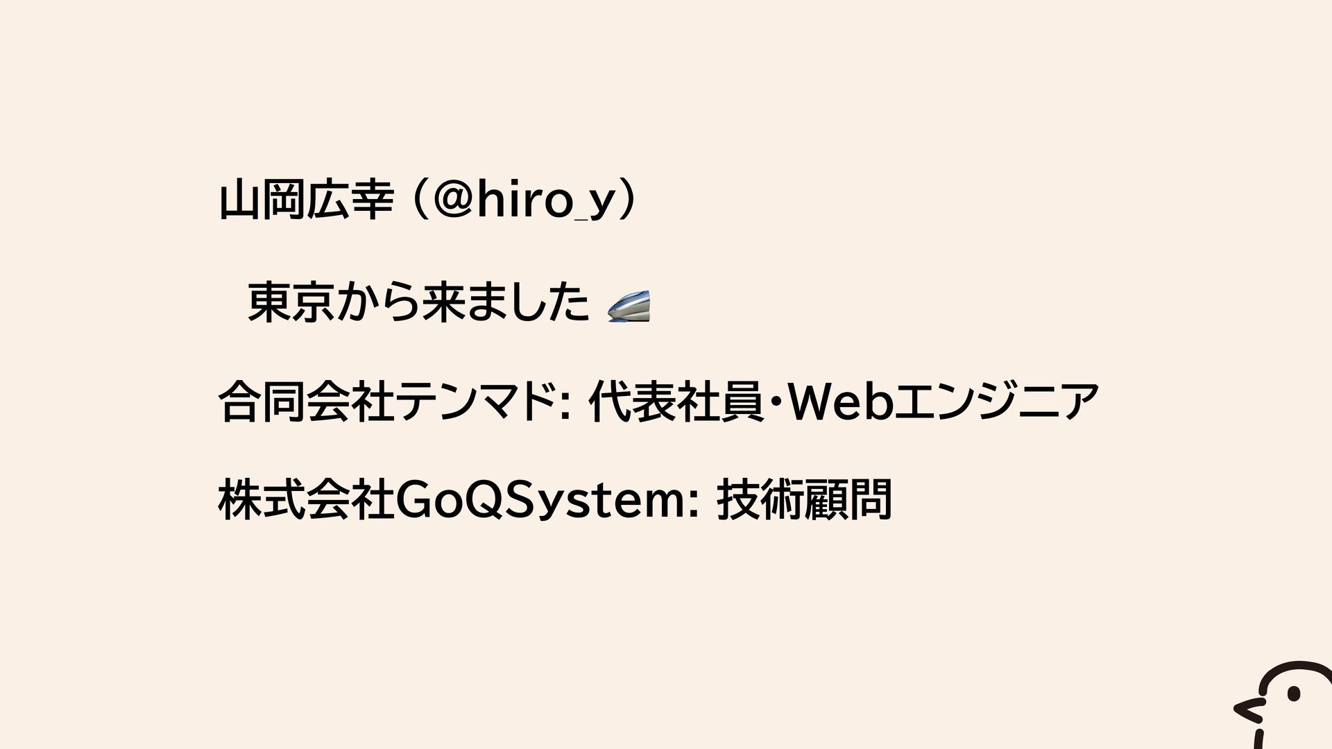 山岡広幸 (@hiro_y) 東京から来ました 🚄 合同会社テンマド: 代表社員・Webエンジニア 株式会社GoQSystem: 技術顧問