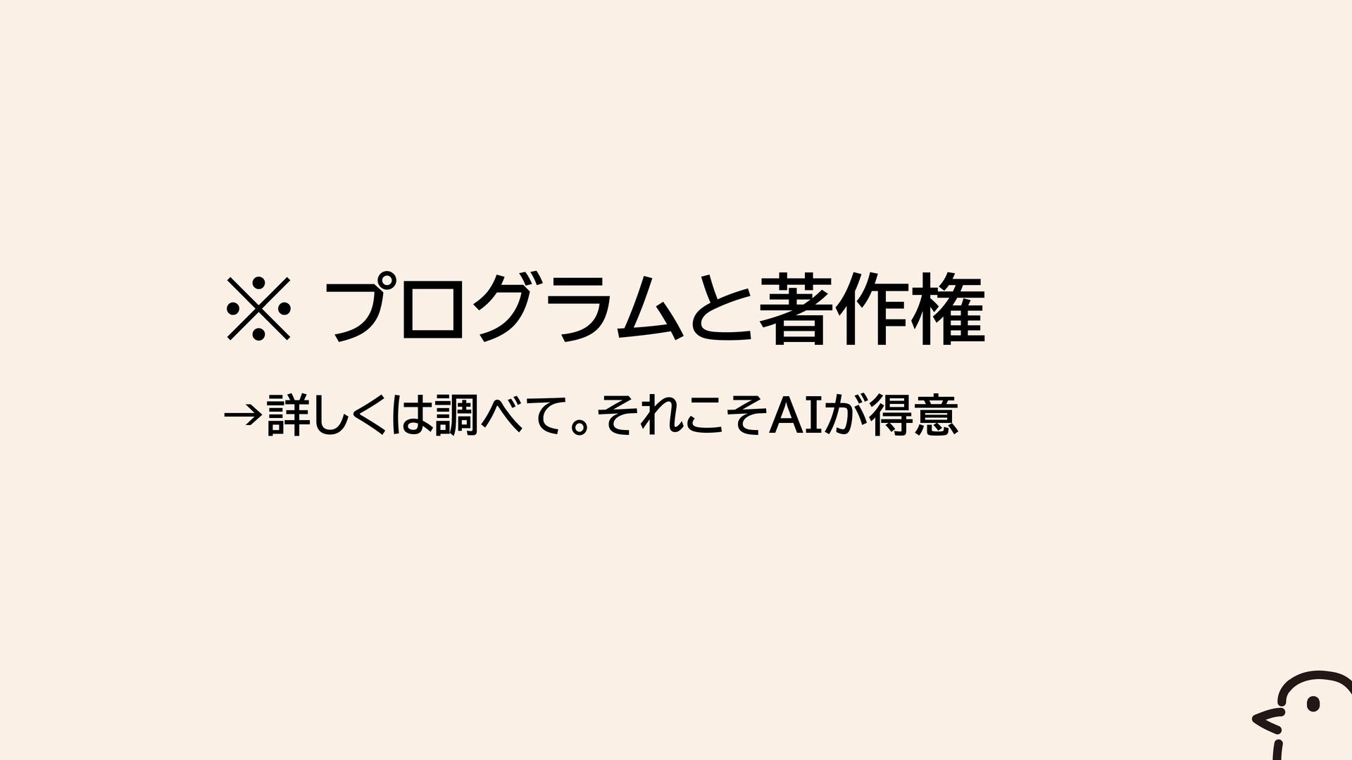 ※ プログラムと著作権 →詳しくは調べて。それこそAIが得意