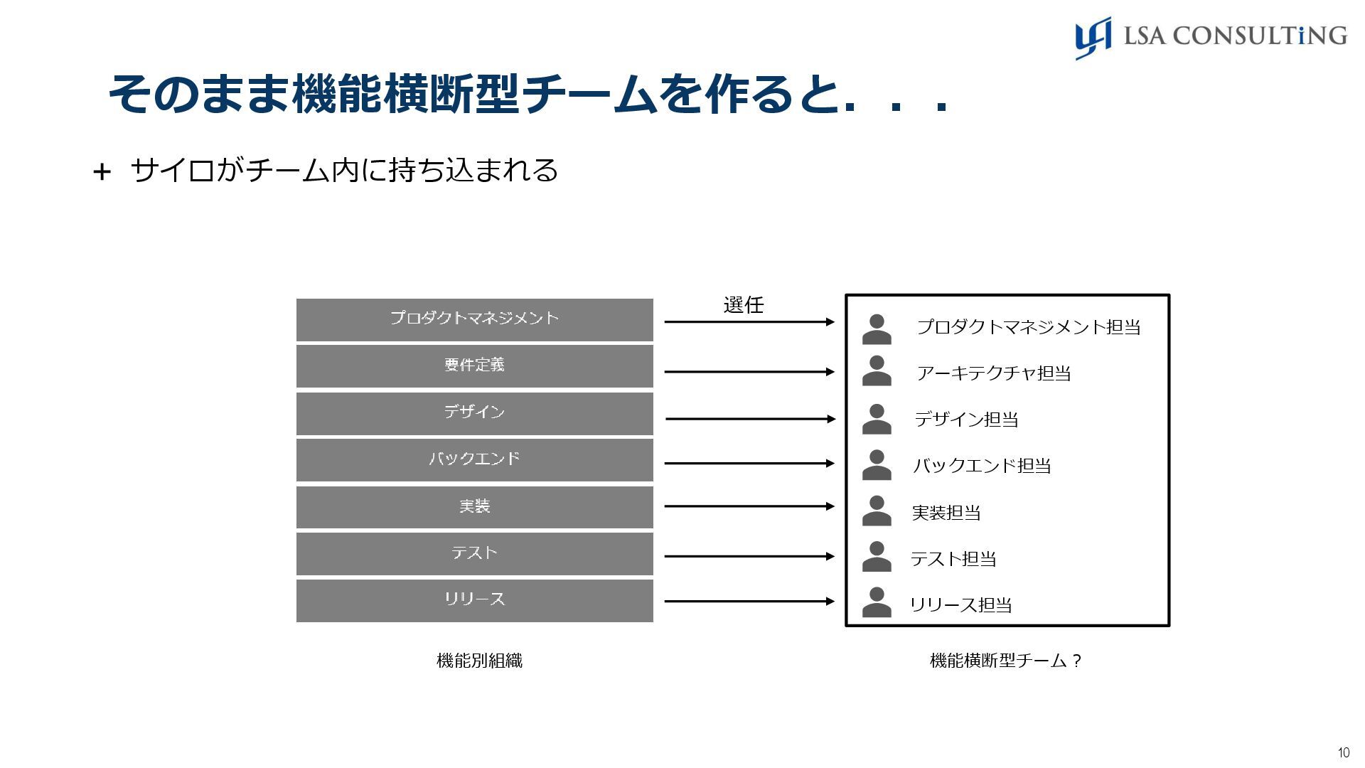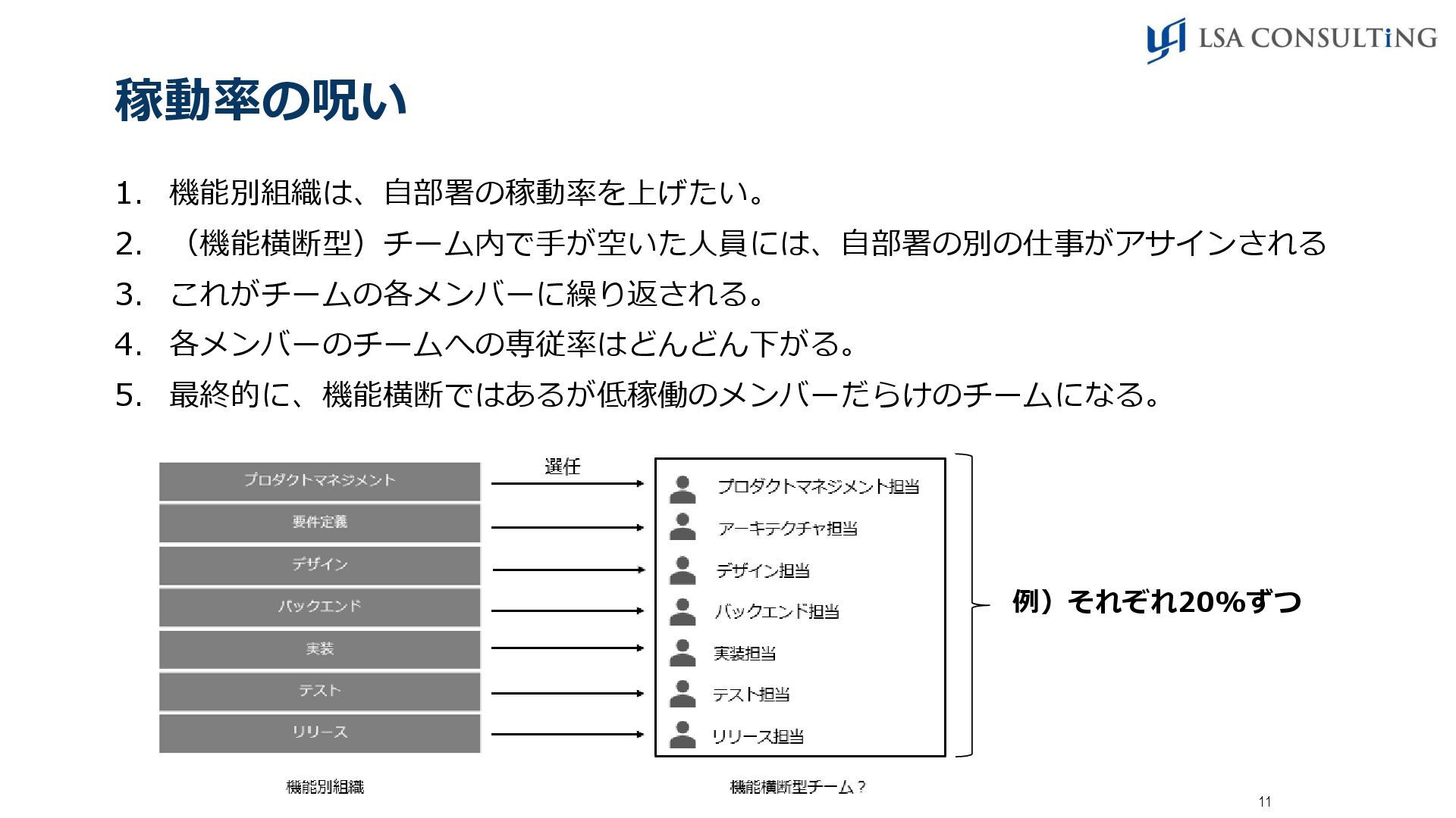 1. 機能別組織は、自部署の稼動率を上げたい。 2. (機能横断型)チーム内で手が空いた人員には、自部署の別の仕事がアサインされる 3. これがチームの各メンバーに繰り返される。 4. 各メンバーのチームへの専従率はどんどん下がる。 5. 最終的に、機能横断ではあるが低稼働のメンバーだらけのチームになる。