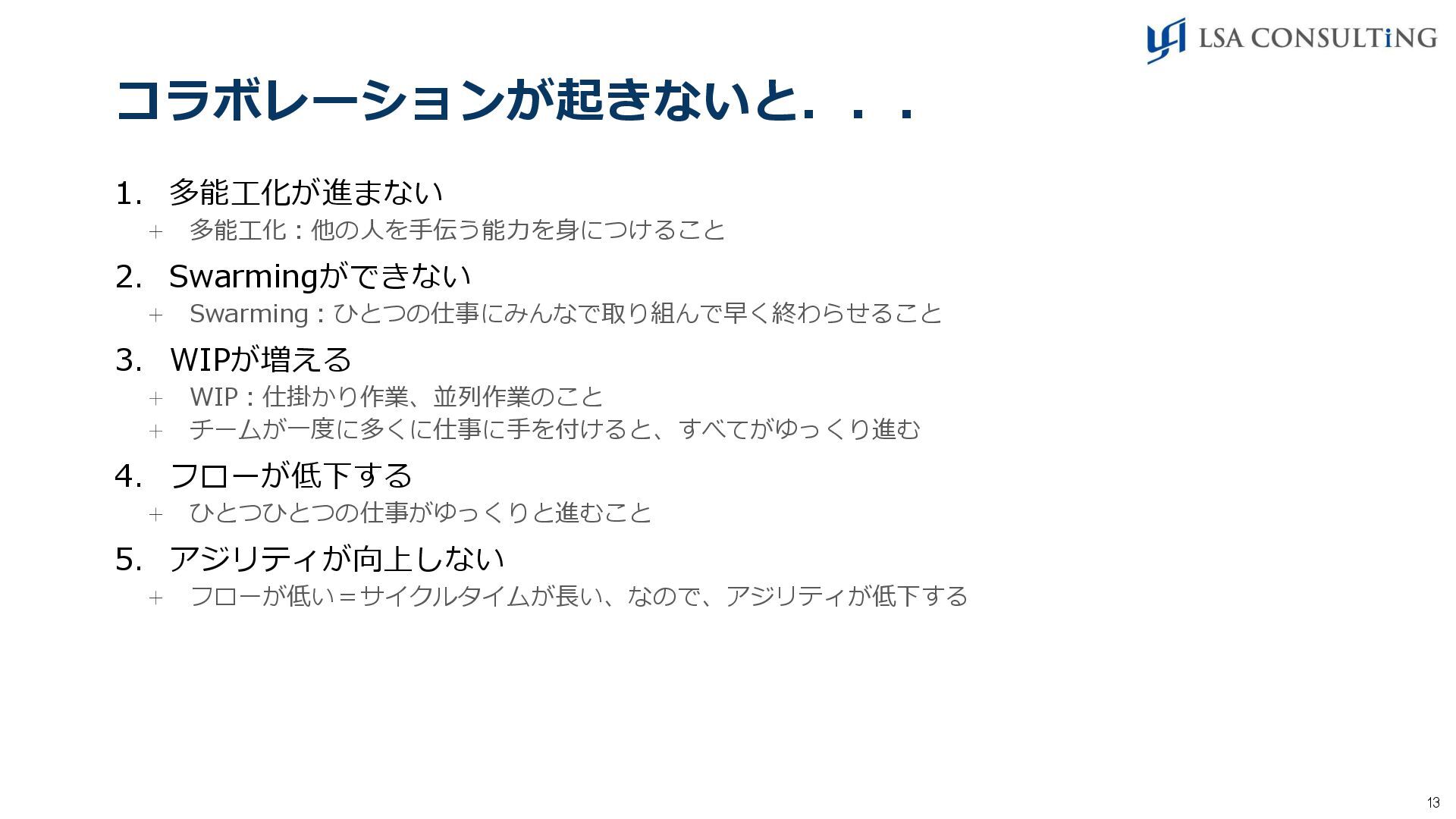 4. フローが低下する ひとつひとつの仕事がゆっくりと進むこと 5. アジリティが向上しない フローが低い=サイクルタイムが長い、なので、アジリティが低下する 13 コラボレーションが起きないと...