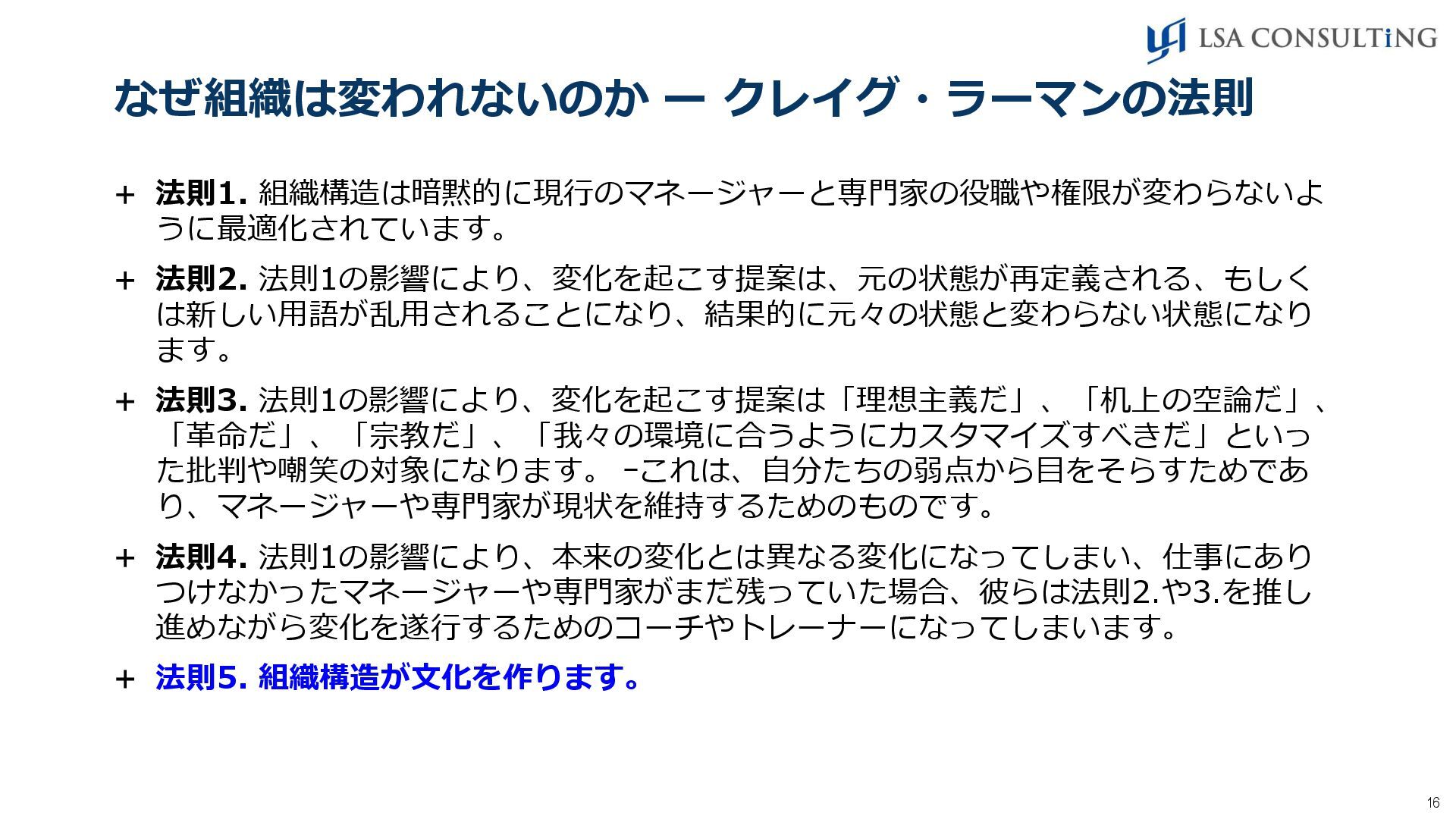 た批判や嘲笑の対象になります。 ーこれは、自分たちの弱点から目をそらすためであ り、マネージャーや専門家が現状を維持するためのものです。 法則4. 法則1の影響により、本来の変化とは異なる変化になってしまい、仕事にあり つけなかったマネージャーや専門家がまだ残っていた場合、彼らは法則2.や3.を推し 進めながら変化を遂行するためのコーチやトレーナーになってしまいます。 法則5. 組織構造が文化を作ります。 16 なぜ組織は変われないのか ー クレイグ・ラーマンの法則