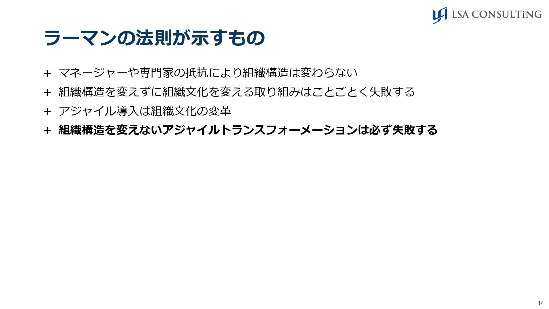 マネージャーや専門家の抵抗により組織構造は変わらない 組織構造を変えずに組織文化を変える取り組みはことごとく失敗する アジャイル導入は組織文化の変革 組織構造を変えないアジャイルトランスフォーメーションは必ず失敗する 17 ラーマンの法則が示すもの
