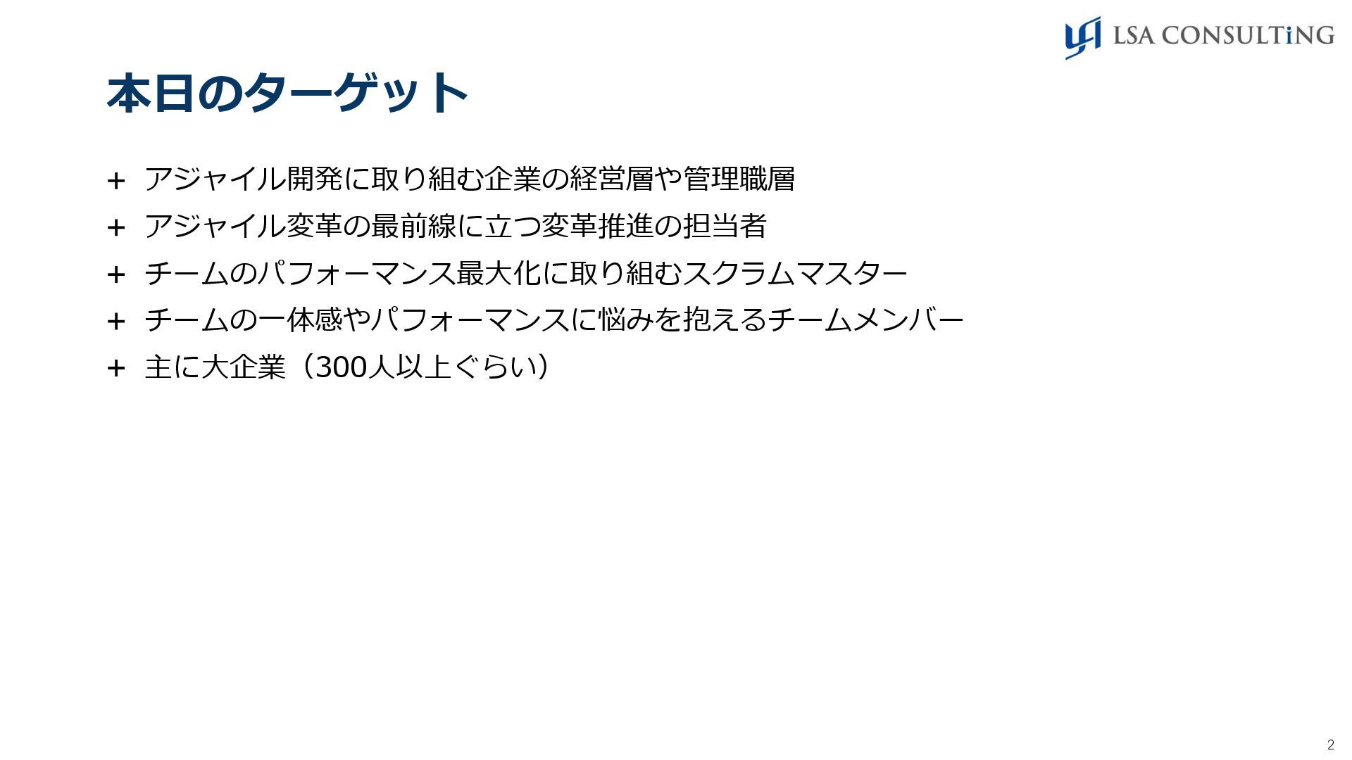 アジャイル開発に取り組む企業の経営層や管理職層 アジャイル変革の最前線に立つ変革推進の担当者 チームのパフォーマンス最大化に取り組むスクラムマスター チームの一体感やパフォーマンスに悩みを抱えるチームメンバー 主に大企業(300人以上ぐらい) 2 本日のターゲット