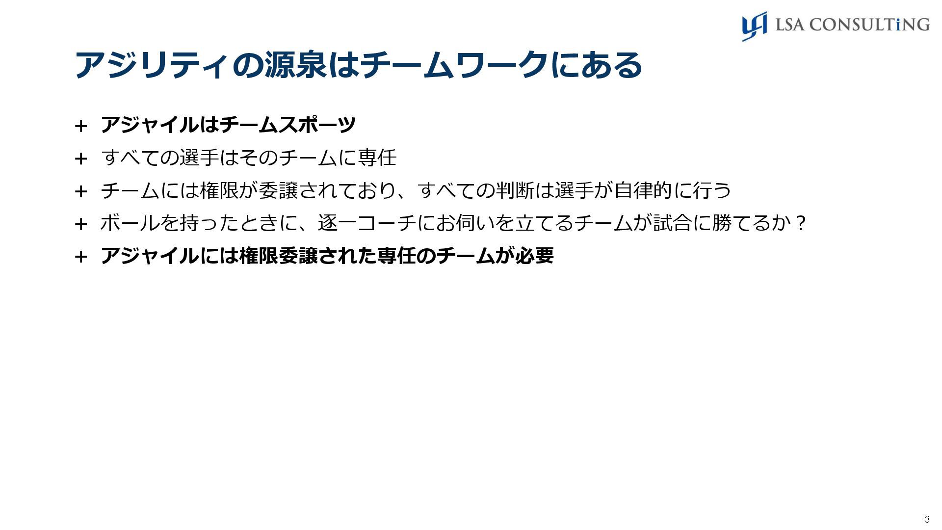 アジャイルはチームスポーツ すべての選手はそのチームに専任 チームには権限が委譲されており、すべての判断は選手が自律的に行う ボールを持ったときに、逐一コーチにお伺いを立てるチームが試合に勝てるか? アジャイルには権限委譲された専任のチームが必要 3 アジリティの源泉はチームワークにある