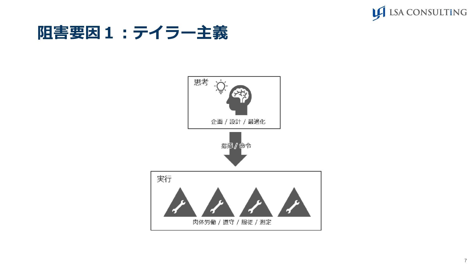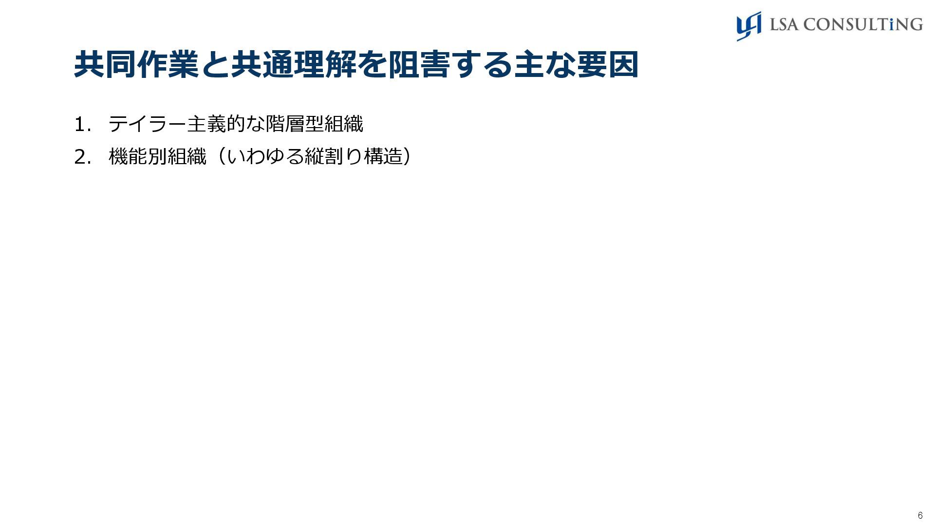 1. テイラー主義的な階層型組織 2. 機能別組織(いわゆる縦割り構造) 6 共同作業と共通理解を阻害する主な要因