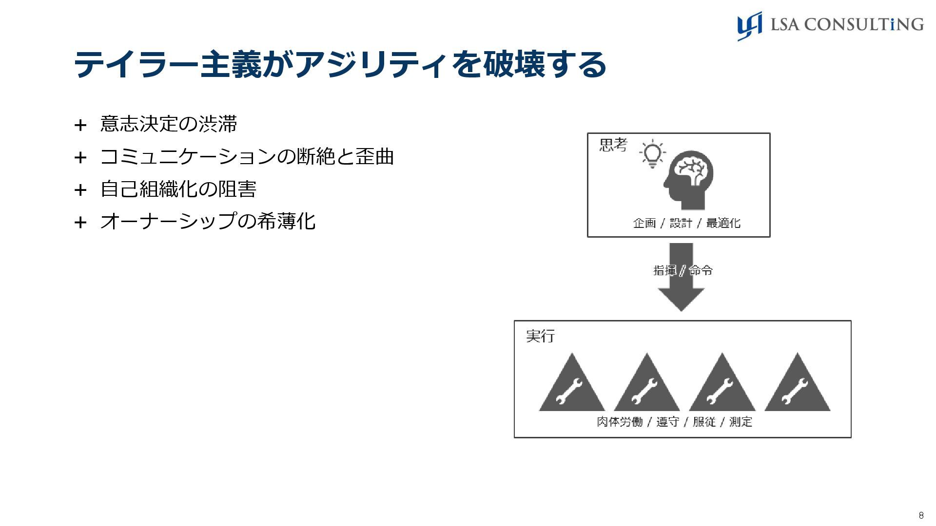 意志決定の渋滞 コミュニケーションの断絶と歪曲 自己組織化の阻害 オーナーシップの希薄化 8 テイラー主義がアジリティを破壊する