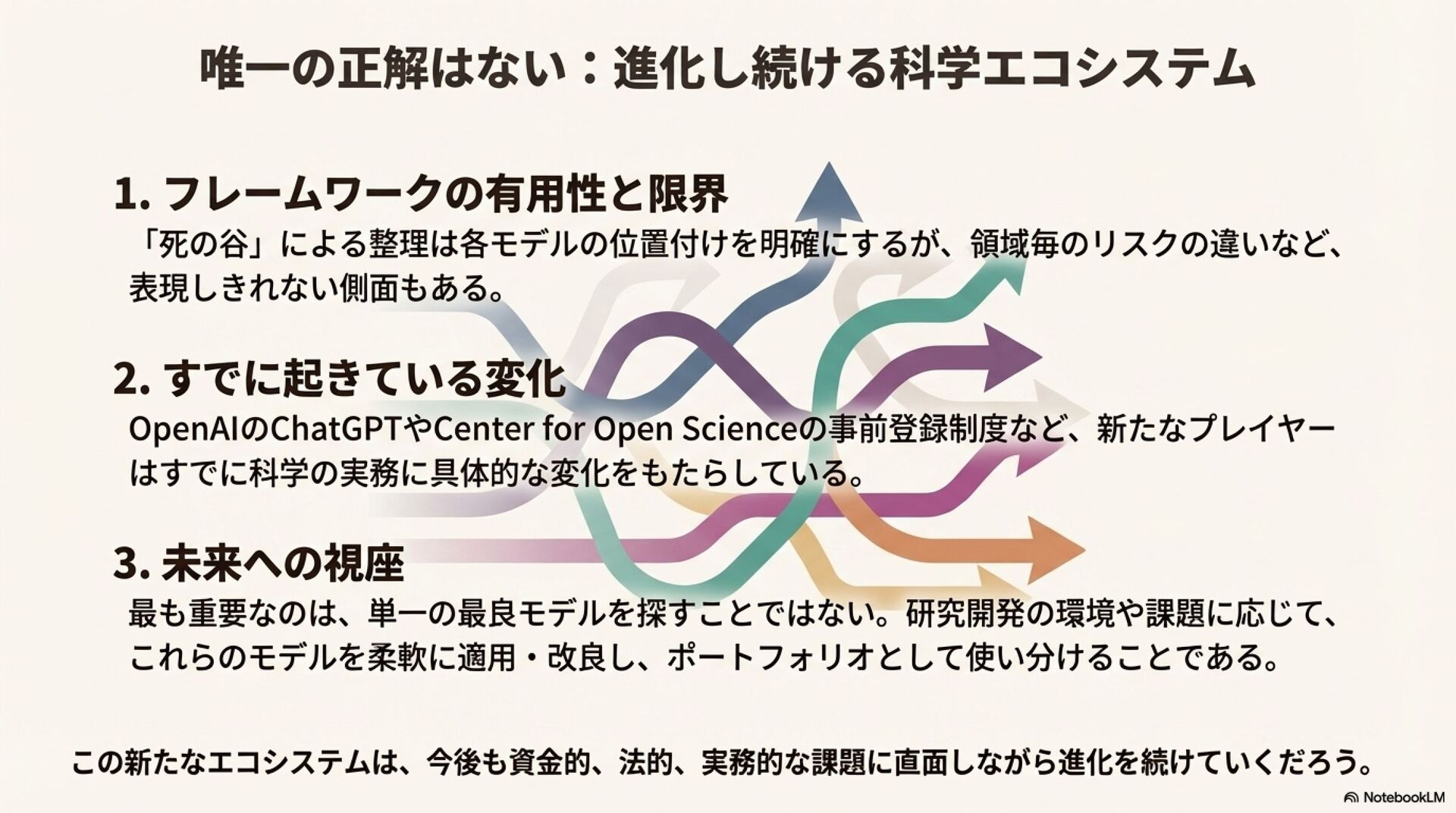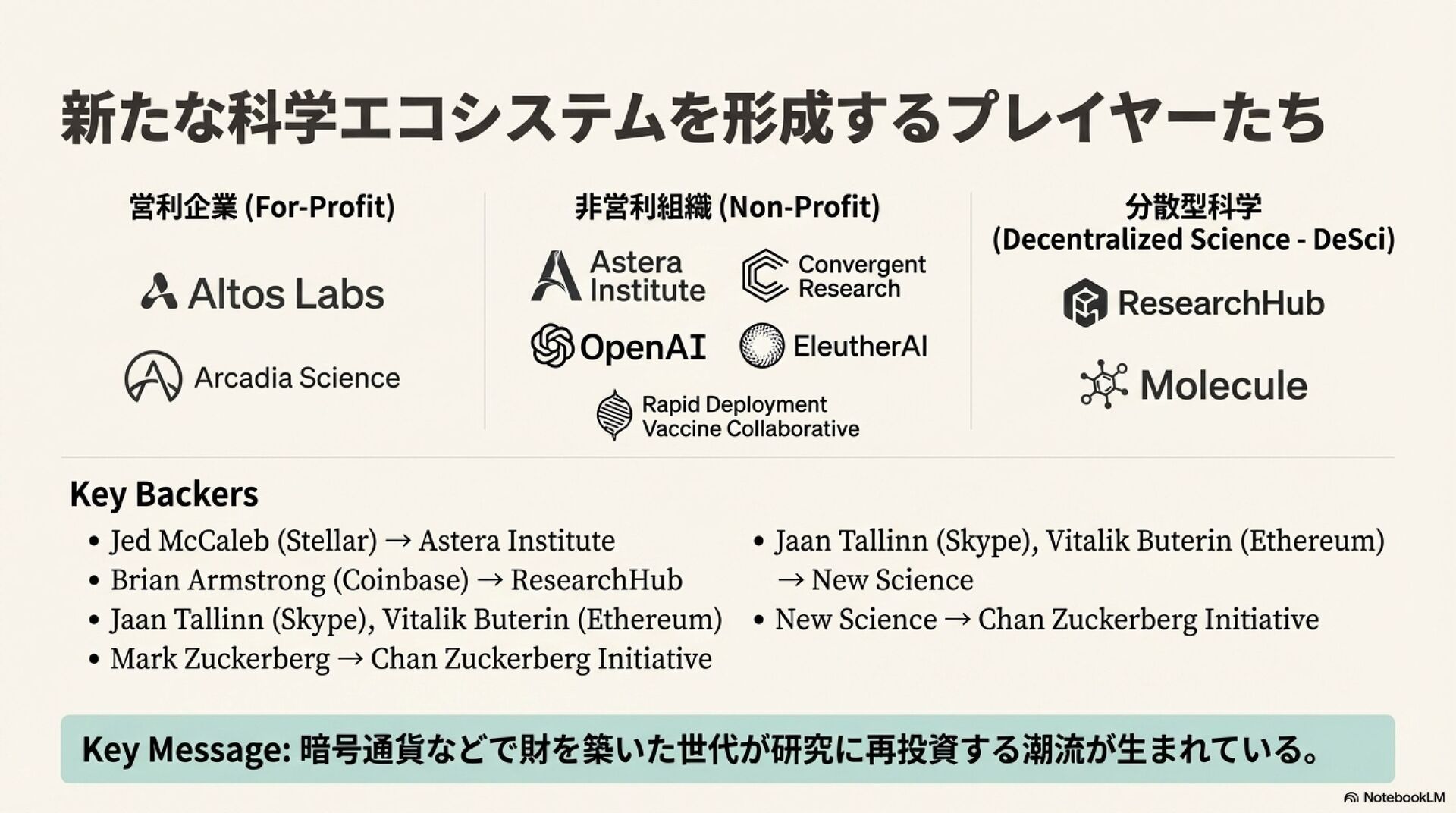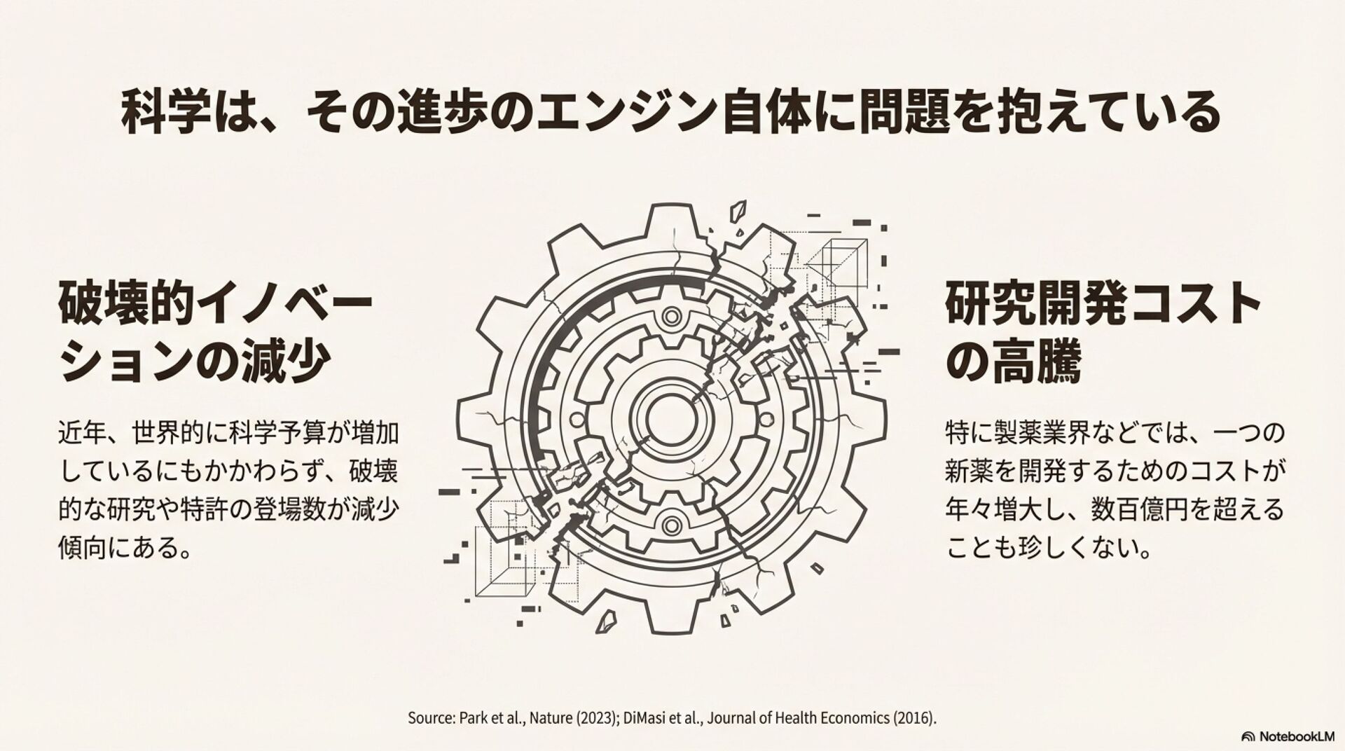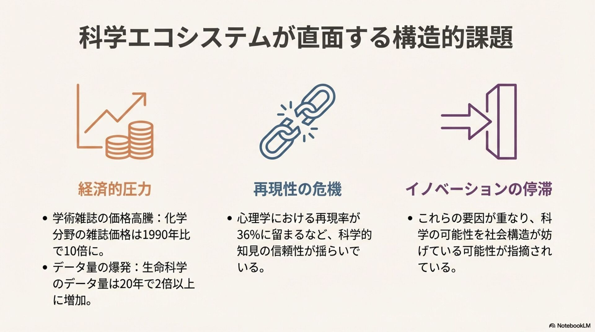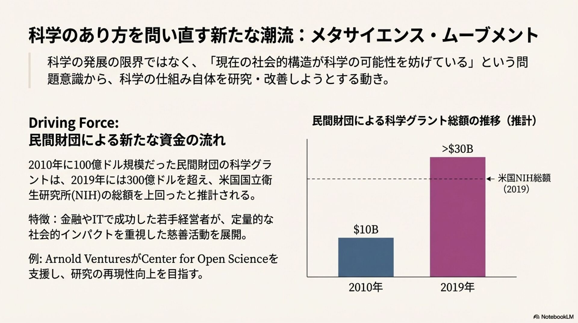 科学界は、破壊的イノベーションの減少、研究開発コストの増大、研究の再現性の問題といった深刻な課題に直面している。これらの状況を背景に、既存の科学のあり方を見直し、その社会的構造自体を改革しようとする「メタサイエンス・ムーブメント」が台頭している。この動きは、インパクトを重視する民間財団や、金融・IT分野で成功した起業家による積極的な資金提供に支えられている。