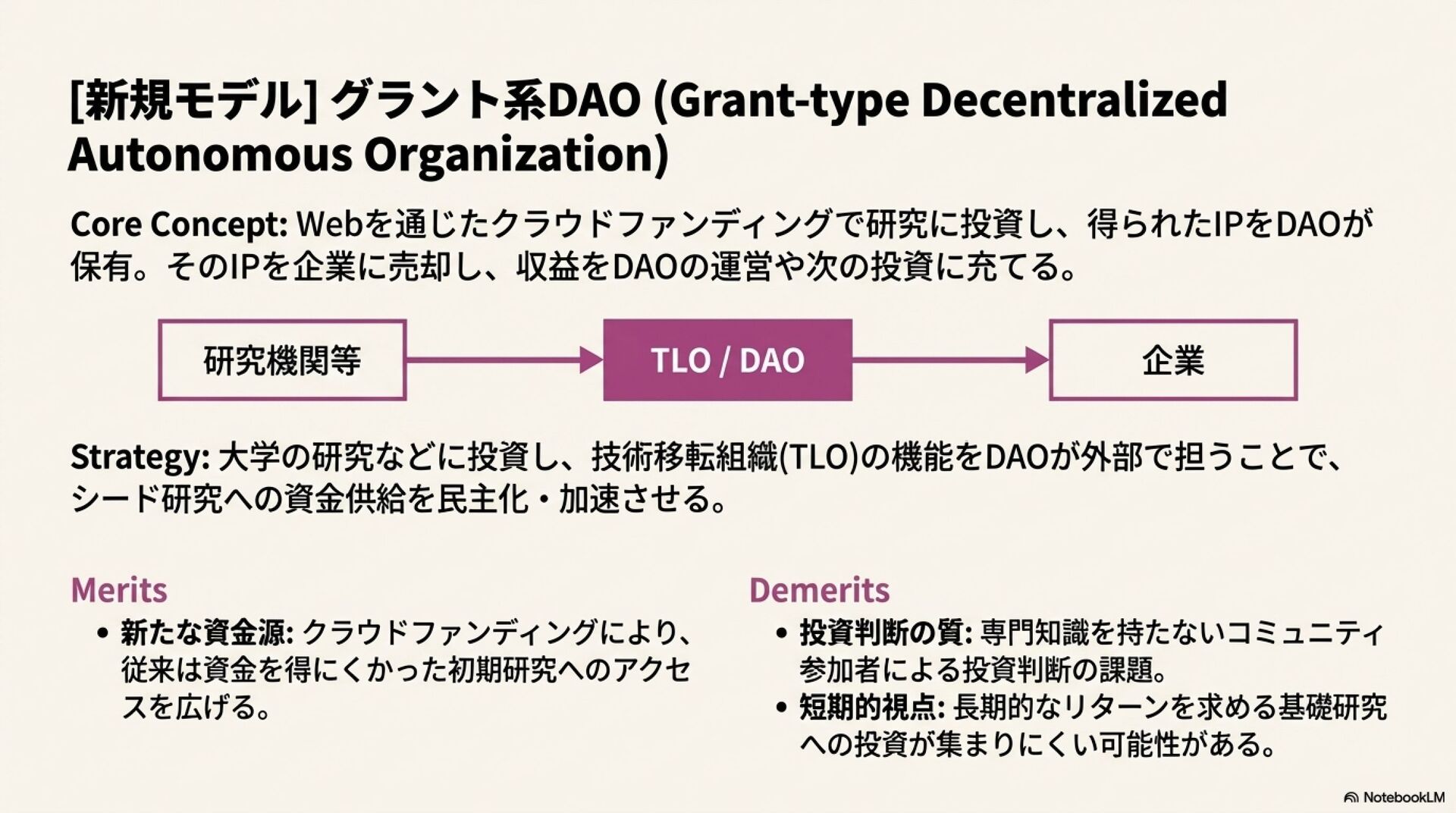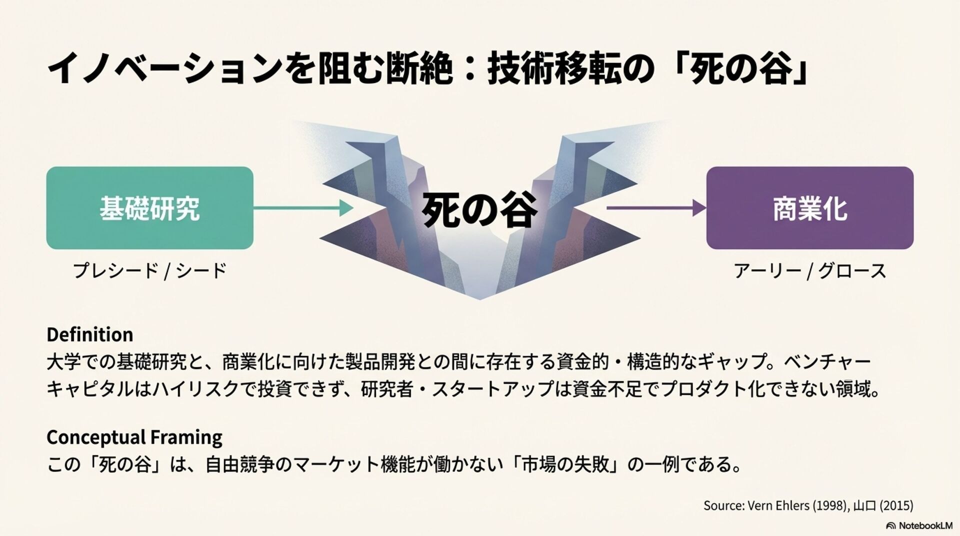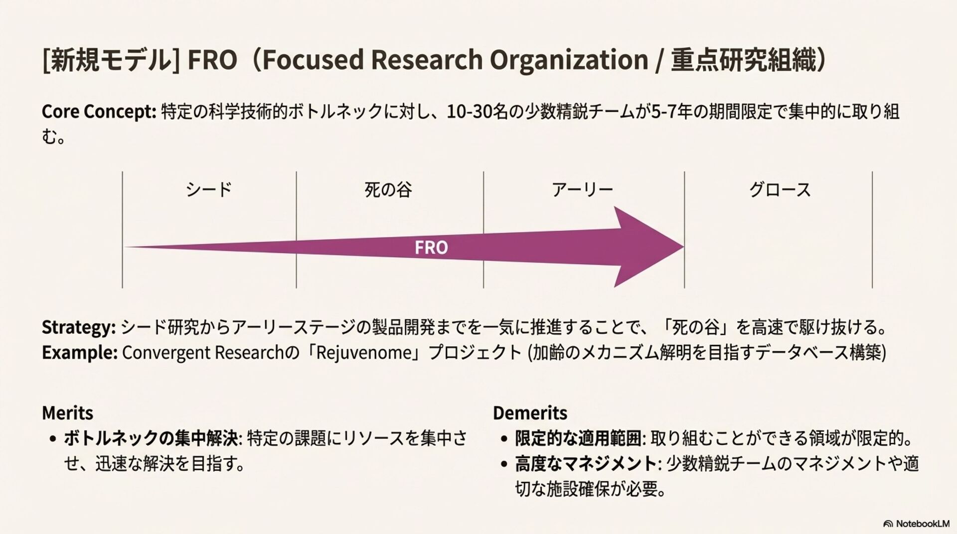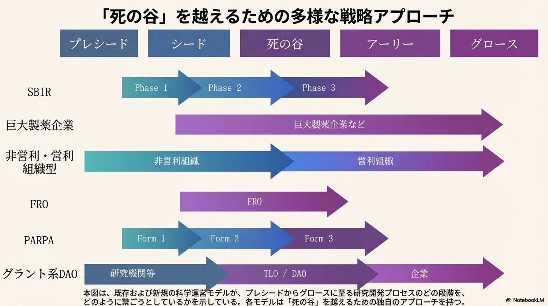 このムーブメントの中から、重点研究組織(FRO)、民間型高等研究計画局(PARPA)、グラント系自律分散型組織(DAO)といった、新たな科学運営モデルが次々と生まれている。これらのモデルは、基礎研究の成果を商業化へつなぐ過程で生じる資金的・構造的な障壁、いわゆる「技術移転の死の谷」を克服するための、それぞれ独自のアプローチを提示している。