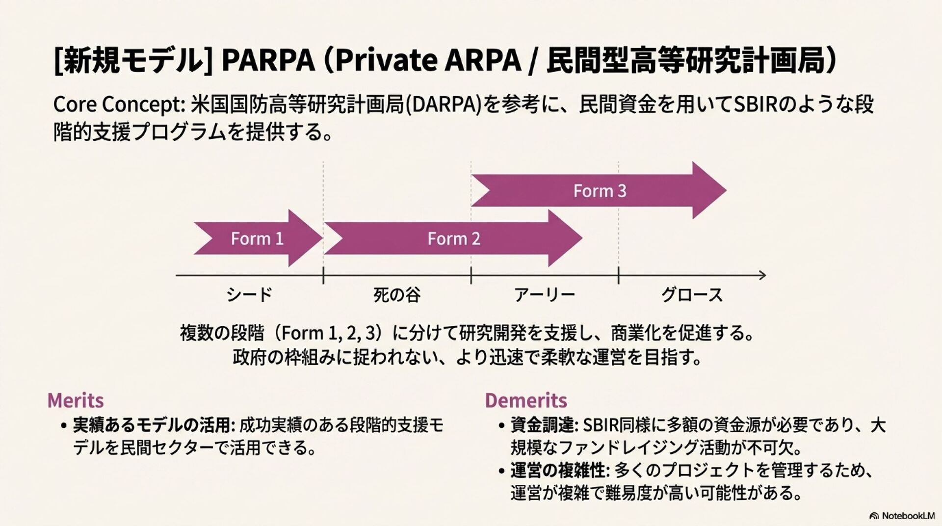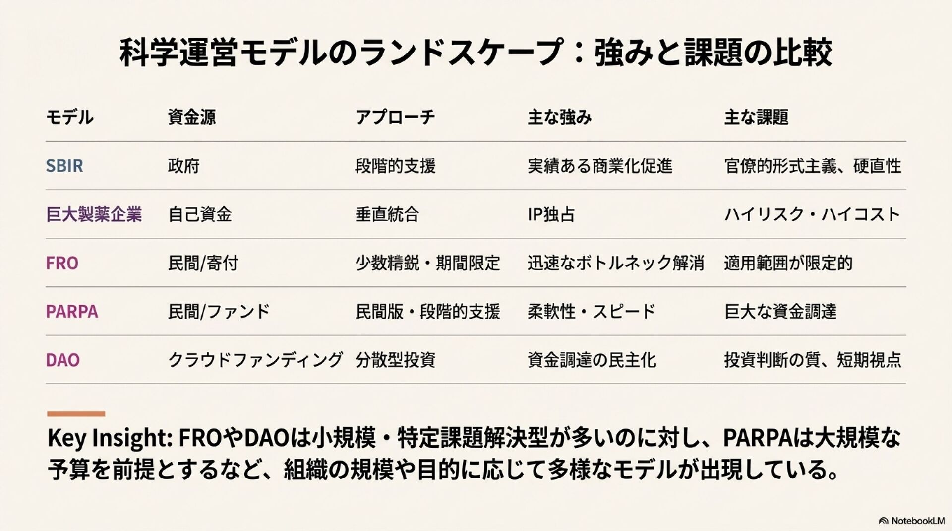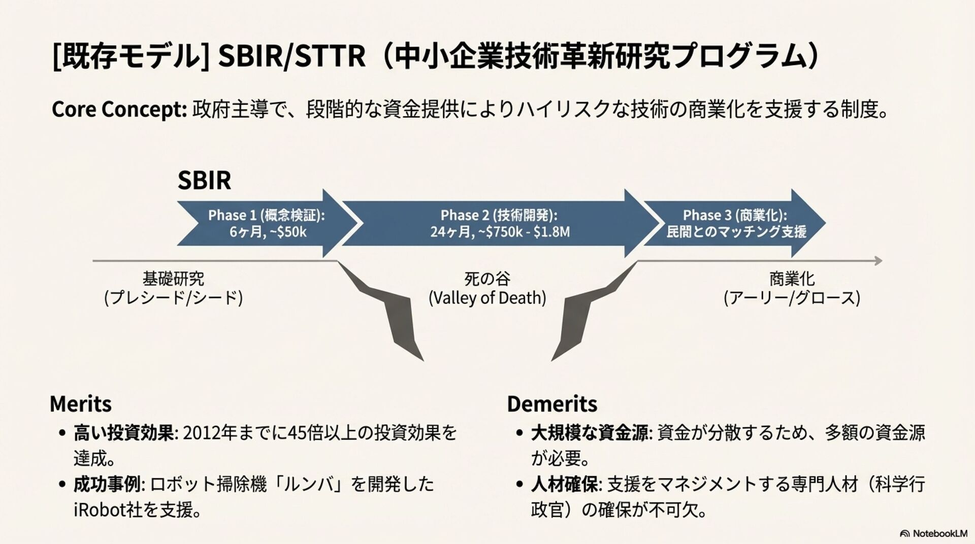 本報告書は、これらの新たな科学運営モデルを、政府による成功事例である米国の中小企業技術革新研究プログラム(SBIR/STTR)制度と比較し、「死の谷」の観点から各モデルの構造、利点、そして課題を体系的に整理・分析する。これにより、現代の科学エコシステムで起きている地殻変動の理解を深め、今後の研究開発支援のあり方を考察するための基盤を提供する。