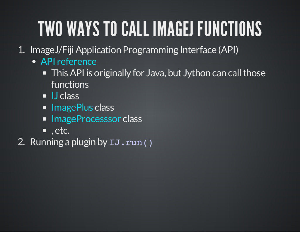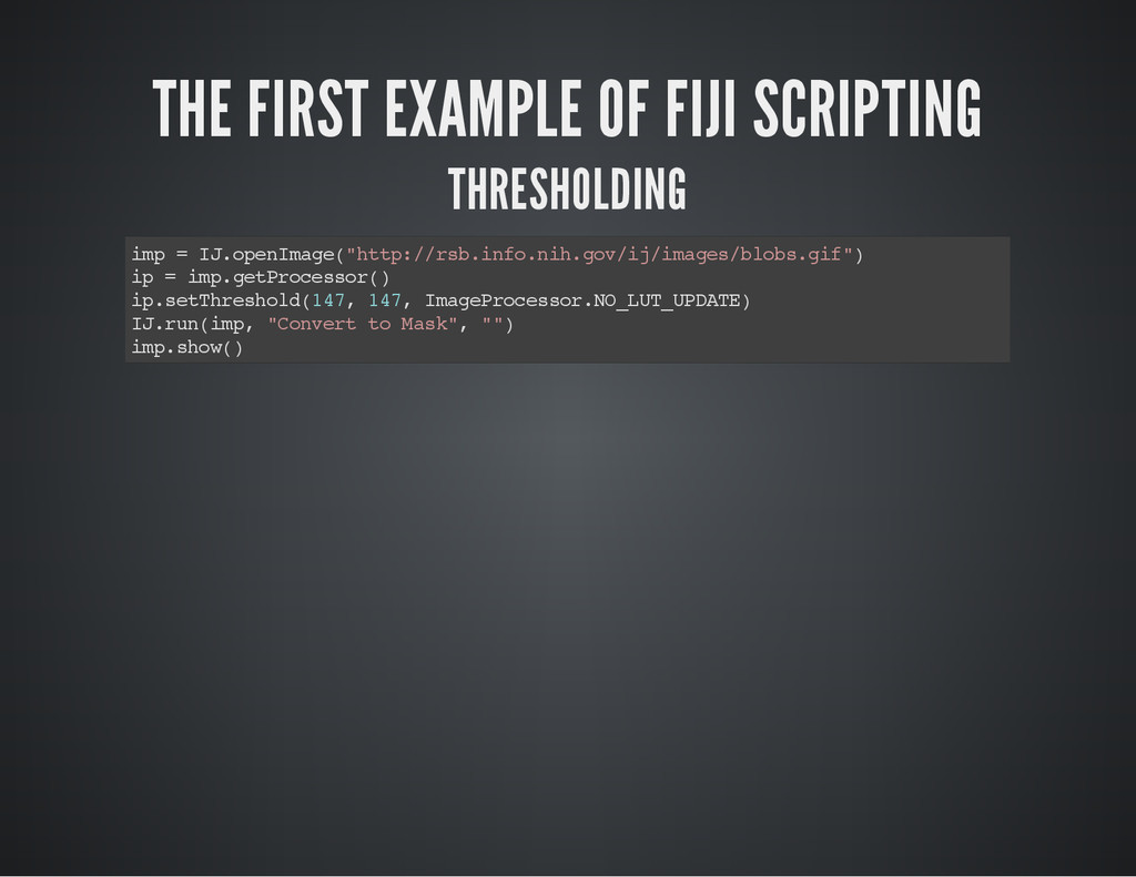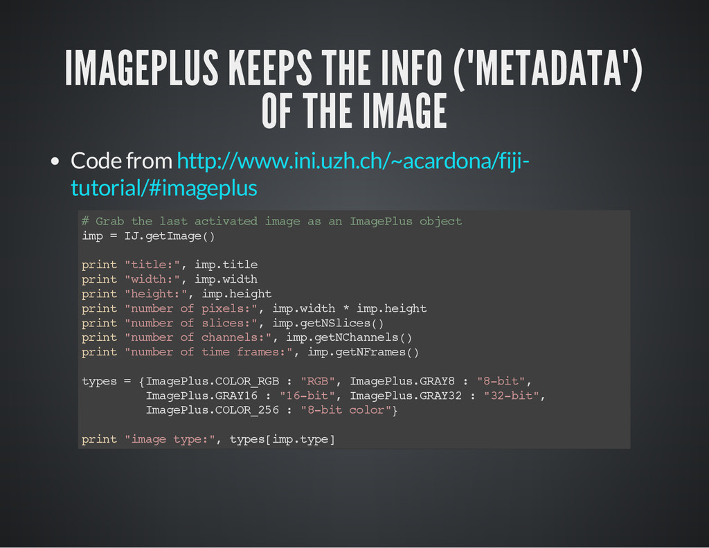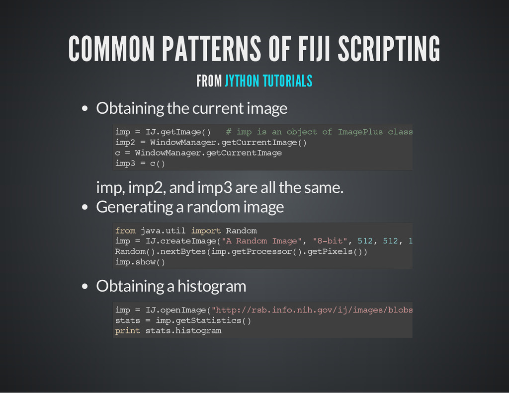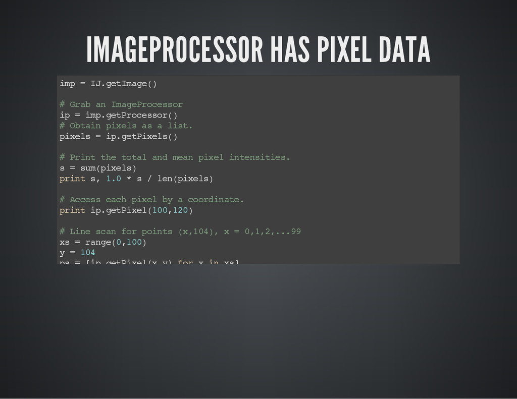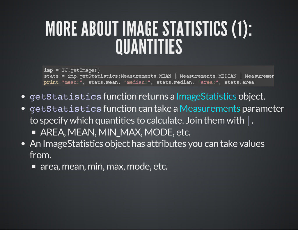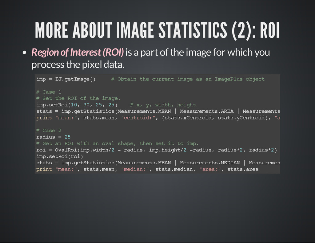 is a part of the image for which you process the pixel data. i m p = I J . g e t I m a g e ( ) # O b t a i n t h e c u r r e n t i m a g e a s a n I m a g e P l u s o b j e c t # C a s e 1 # S e t t h e R O I o f t h e i m a g e . i m p . s e t R o i ( 1 0 , 3 0 , 2 5 , 2 5 ) # x , y , w i d t h , h e i g h t s t a t s = i m p . g e t S t a t i s t i c s ( M e a s u r e m e n t s . M E A N | M e a s u r e m e n t s . A R E A | M e a s u r e m e n t s . C E N T R O I D ) p r i n t " m e a n : " , s t a t s . m e a n , " c e n t r o i d : " , ( s t a t s . x C e n t r o i d , s t a t s . y C e n t r o i d ) , " a r e a : " , s t a t s # C a s e 2 r a d i u s = 2 5 # G e t a n R O I w i t h a n o v a l s h a p e , t h e n s e t i t t o i m p . r o i = O v a l R o i ( i m p . w i d t h / 2 - r a d i u s , i m p . h e i g h t / 2 - r a d i u s , r a d i u s * 2 , r a d i u s * 2 ) i m p . s e t R o i ( r o i ) s t a t s = i m p . g e t S t a t i s t i c s ( M e a s u r e m e n t s . M E A N | M e a s u r e m e n t s . M E D I A N | M e a s u r e m e n t s . A R E A ) p r i n t " m e a n : " , s t a t s . m e a n , " m e d i a n : " , s t a t s . m e d i a n , " a r e a : " , s t a t s . a r e a