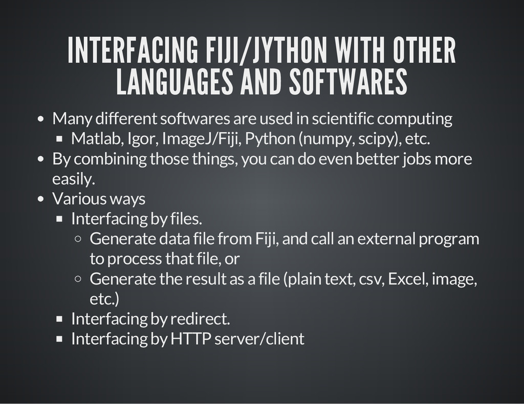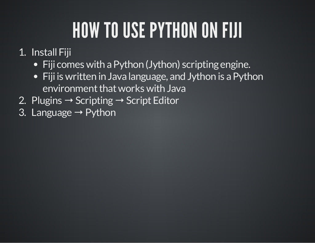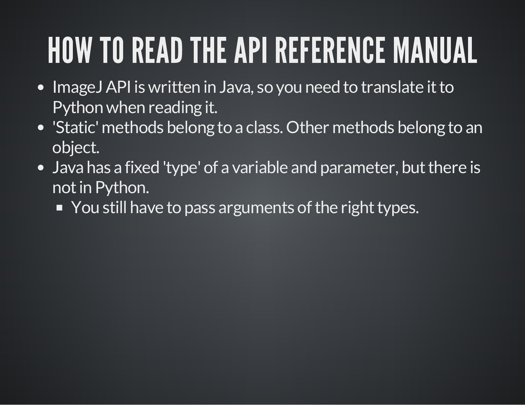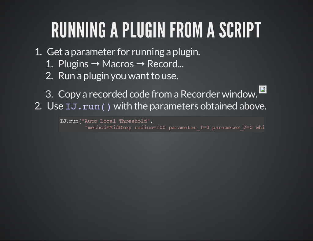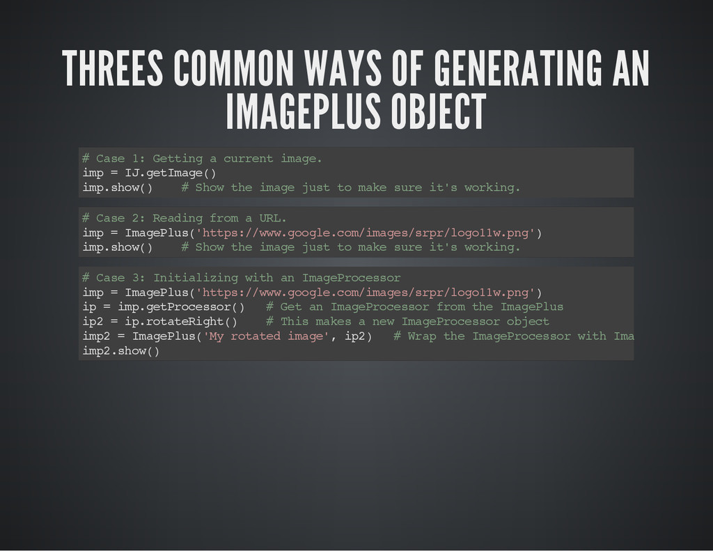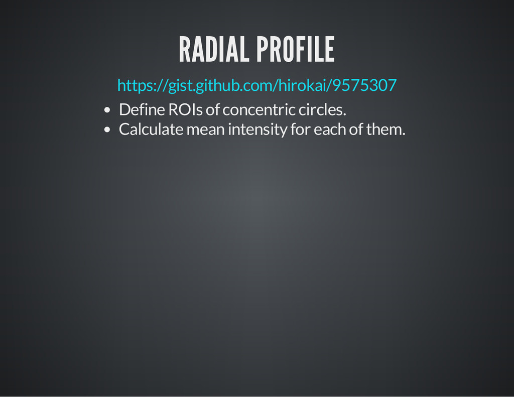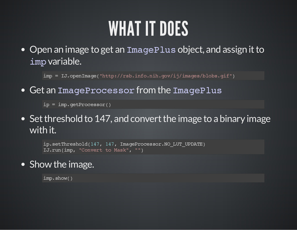 is a part of the image for which you process the pixel data. i m p = I J . g e t I m a g e ( ) # O b t a i n t h e c u r r e n t i m a g e a s a n I m a g e P l u s o b j e c t # C a s e 1 # S e t t h e R O I o f t h e i m a g e . i m p . s e t R o i ( 1 0 , 3 0 , 2 5 , 2 5 ) # x , y , w i d t h , h e i g h t s t a t s = i m p . g e t S t a t i s t i c s ( M e a s u r e m e n t s . M E A N | M e a s u r e m e n t s . A R E A | M e a s u r e m e n t s . C E N T R O I D ) p r i n t " m e a n : " , s t a t s . m e a n , " c e n t r o i d : " , ( s t a t s . x C e n t r o i d , s t a t s . y C e n t r o i d ) , " a r e a : " , s t a t s # C a s e 2 r a d i u s = 2 5 # G e t a n R O I w i t h a n o v a l s h a p e , t h e n s e t i t t o i m p . r o i = O v a l R o i ( i m p . w i d t h / 2 - r a d i u s , i m p . h e i g h t / 2 - r a d i u s , r a d i u s * 2 , r a d i u s * 2 ) i m p . s e t R o i ( r o i ) s t a t s = i m p . g e t S t a t i s t i c s ( M e a s u r e m e n t s . M E A N | M e a s u r e m e n t s . M E D I A N | M e a s u r e m e n t s . A R E A ) p r i n t " m e a n : " , s t a t s . m e a n , " m e d i a n : " , s t a t s . m e d i a n , " a r e a : " , s t a t s . a r e a