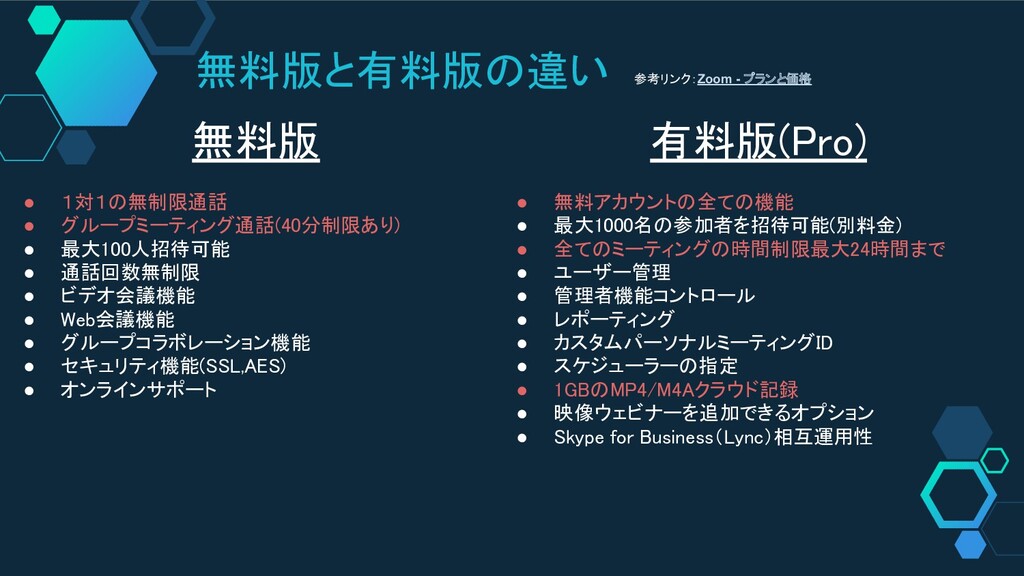 無料版と有料版の違い ~選択のポイント~ • ほぼ1対1のミーティングのみ • 参加することはあるが、MTGを主催することは殆ど ない • 開催されるミーティングは40分以内で収めることが