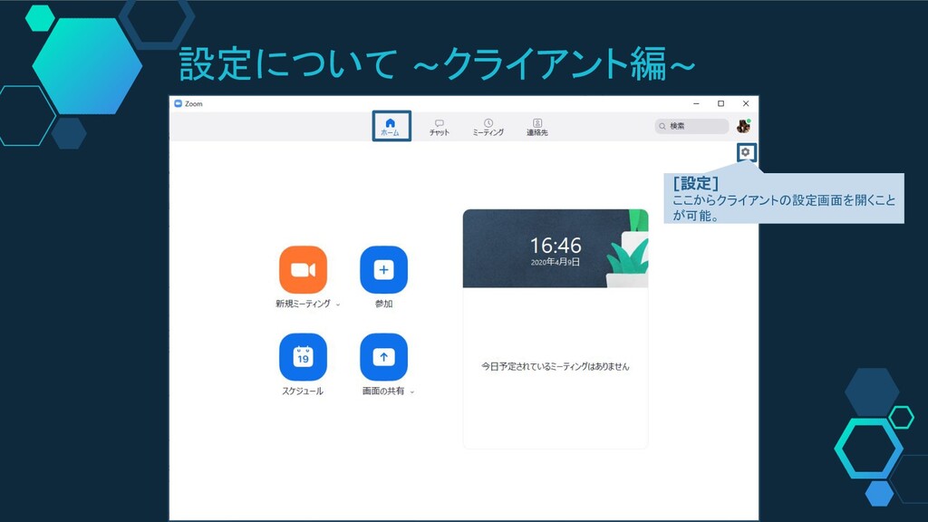ホームメニュー [設定] 詳細な説明は後述 [新規ミーティング] ミーティングの開始時に利用するボタン [参加] ミーティングに参加する際に利用するボタン [スケジュール]