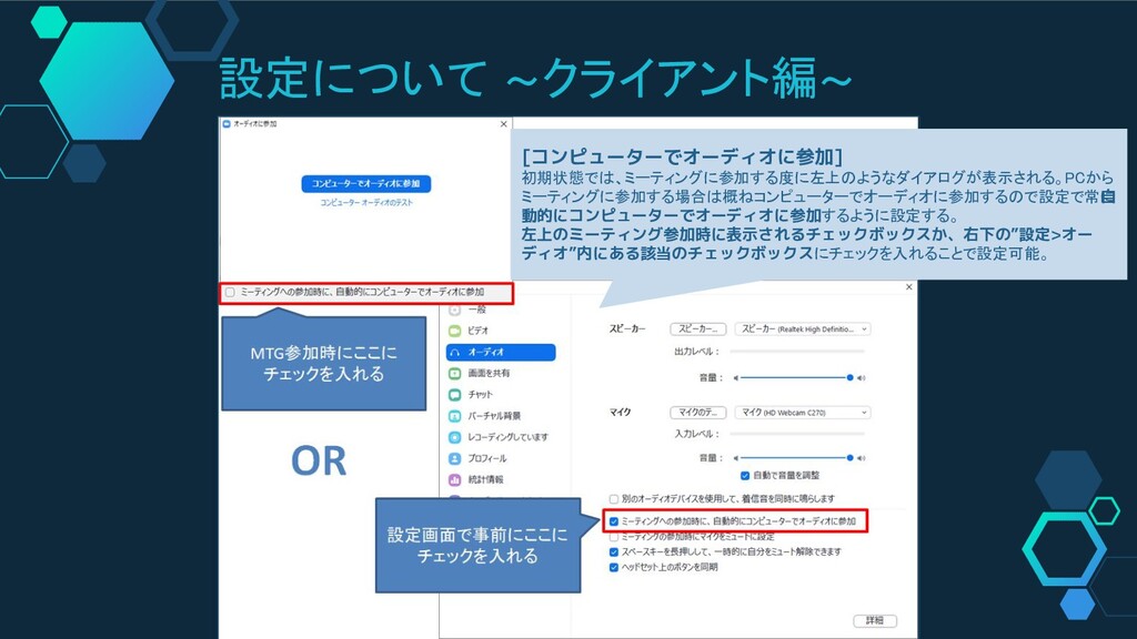 設定について ~クライアント編~ [コンピューターでオーディオに参加] 初期状態では、ミーティングに参加する度に左上のようなダイアログが表示される。PCから ミーティングに参加する場合は概ねコンピューターでオーディオに参加するので設定で常に 自 動的にコンピューターでオーディオに参加するように設定する。 左上のミーティング参加時に表示されるチェックボックスか、右下の”設定>オー ディオ”内にある該当のチェックボックスにチェックを入れることで設定可能。