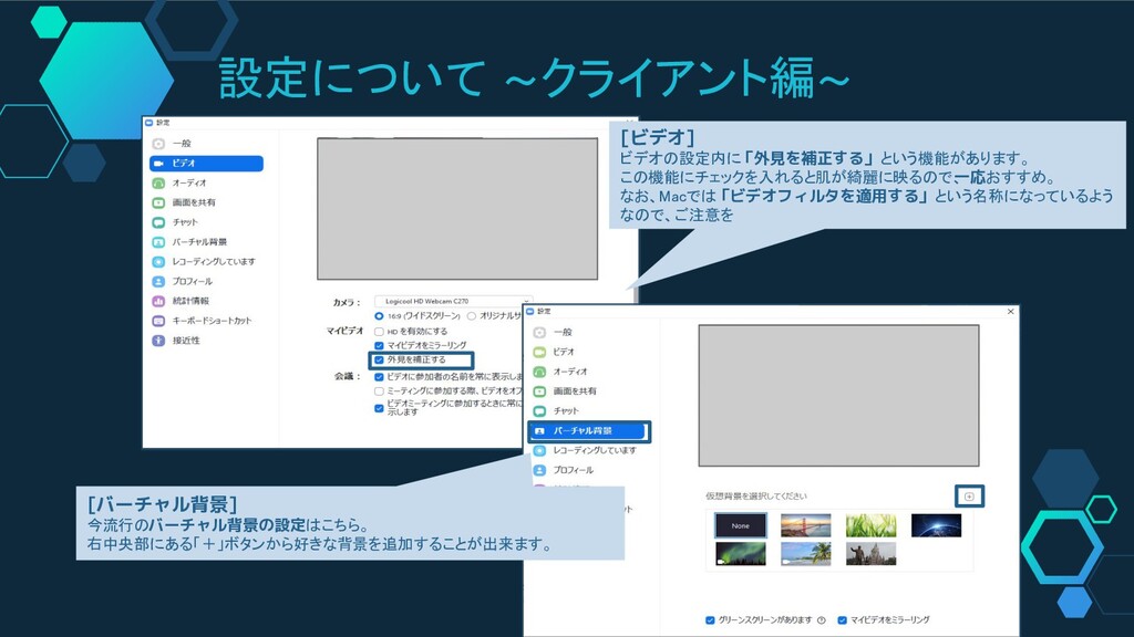 設定について ~クライアント編~ [ビデオ] ビデオの設定内に「外見を補正する」という機能があります。 この機能にチェックを入れると肌が綺麗に映るので、 一応おすすめ。 なお、Macでは「ビデオフィルタを適用する」という名称になっているよう なので、ご注意を [バーチャル背景]