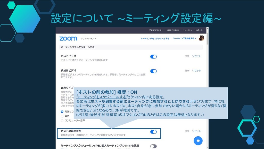 設定について ~ミーティング設定編~ [ホストの前の参加] 推奨:ON “ミーティングをスケジュールする” セクション内にある設定。 参加者はホストが到着する前にミーティングに参加することができるようになります。特に社 内ミーティングが多い人ホストは、ホスト自身が急に参加できない場合にもミーティングが滞りなく開 始できるようになるので、ONが推奨です。