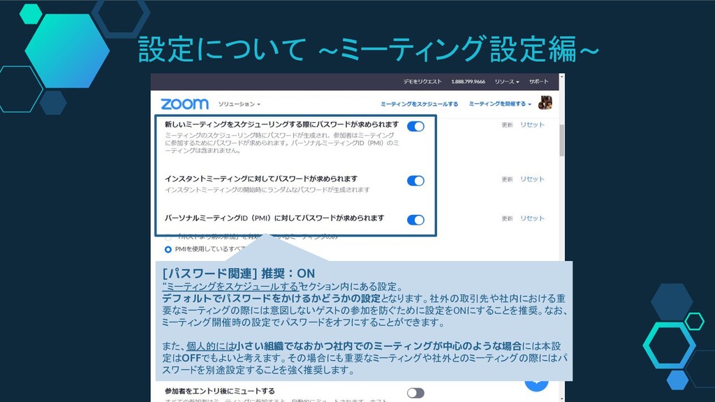 設定について ~ミーティング設定編~ [パスワード関連] 推奨:ON “ミーティングをスケジュールする” セクション内にある設定。 デフォルトでパスワードをかけるかどうかの設定となります。社外の取引先や社内における重 要なミーティングの際には意図しないゲストの参加を防ぐために設定をONにすることを推奨。なお、 ミーティング開催時の設定でパスワードをオフにすることができます。