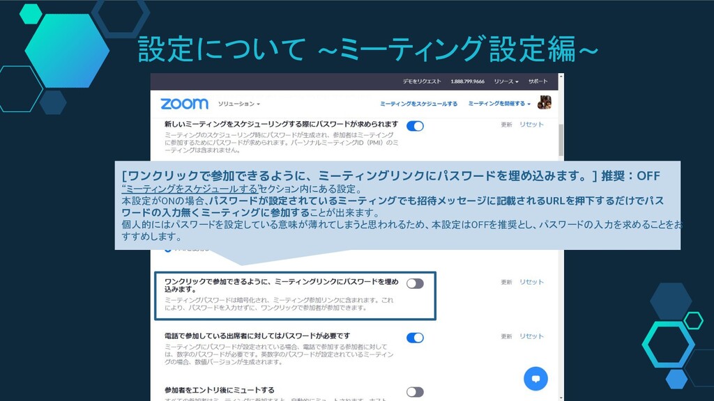 設定について ~ミーティング設定編~ [ワンクリックで参加できるように、ミーティングリンクにパスワードを埋め込みます。] 推奨:OFF “ミーティングをスケジュールする” セクション内にある設定。 本設定がONの場合、 パスワードが設定されているミーティングでも招待メッセージに記載されるURLを押下するだけでパス ワードの入力無くミーティングに参加することが出来ます。