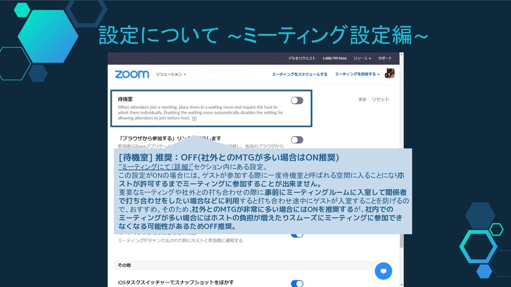 設定について ~ミーティング設定編~ [待機室] 推奨:OFF(社外とのMTGが多い場合はON推奨) “ミーティングにて(詳細) ”セクション内にある設定。 この設定がONの場合には、ゲストが参加する際に一度待機室と呼ばれる空間に入ることになり、 ホ ストが許可するまでミーティングに参加することが出来ません。