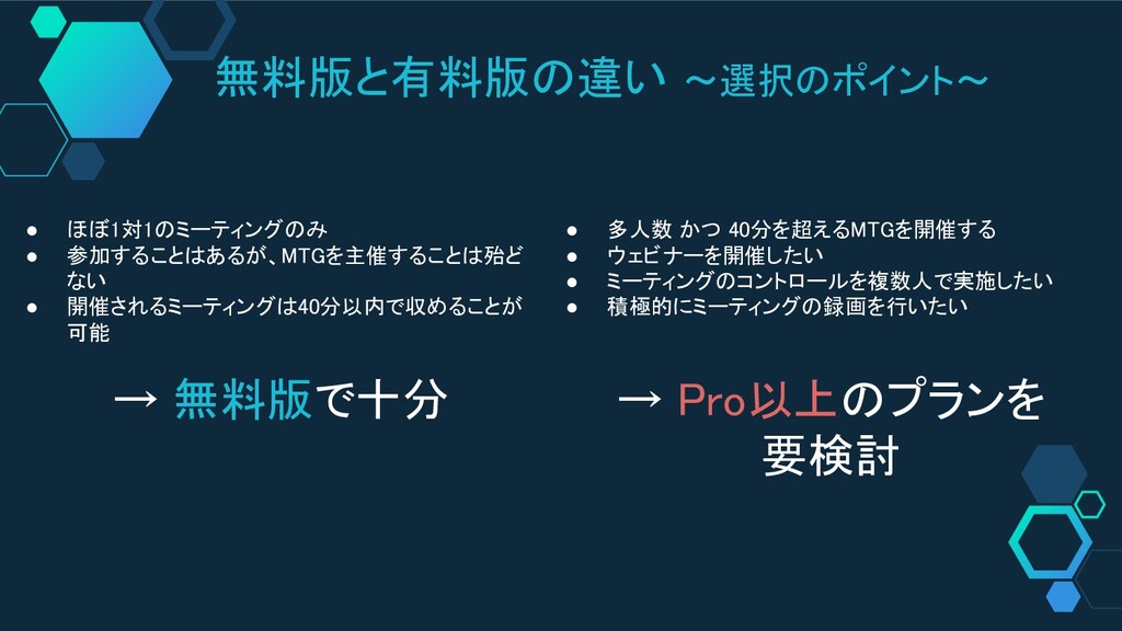 可能 → 無料版で十分 • 多人数 かつ 40分を超えるMTGを開催する • ウェビナーを開催したい • ミーティングのコントロールを複数人で実施したい • 積極的にミーティングの録画を行いたい → Pro以上のプランを 要検討