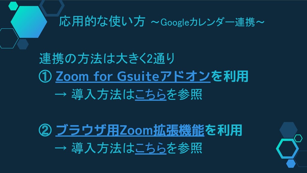 応用的な使い方 ~Googleカレンダー連携~ 連携の方法は大きく2通り ① Zoom for Gsuiteアドオンを利用 → 導入方法はこちらを参照