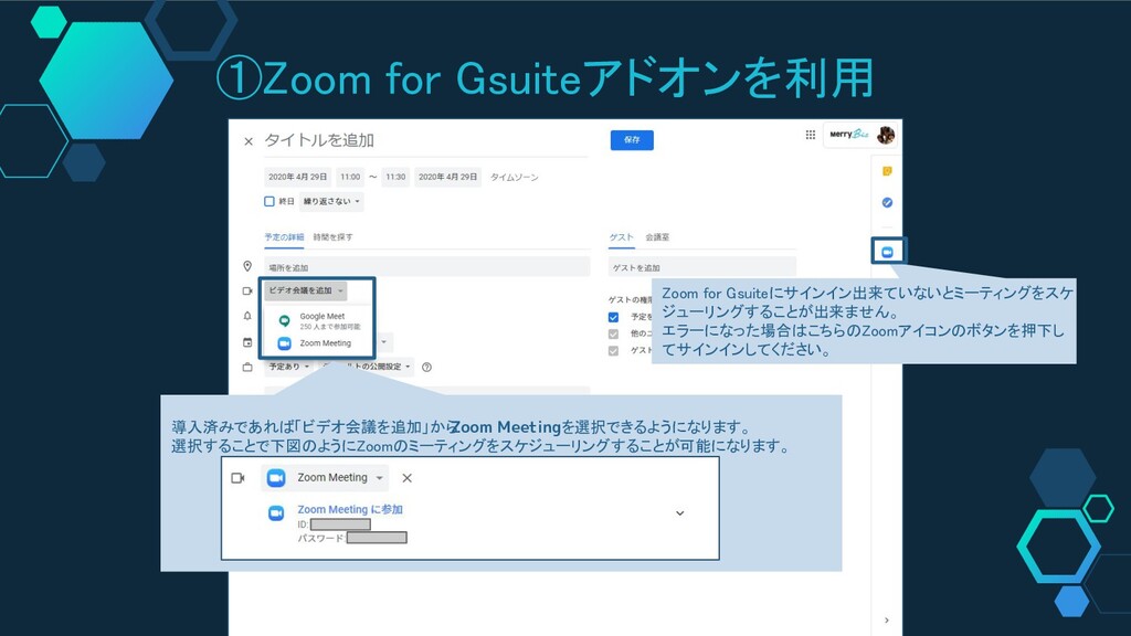 Zoom for Gsuiteにサインイン出来ていないとミーティングをスケ ジューリングすることが出来ません。 エラーになった場合はこちらのZoomアイコンのボタンを押下し てサインインしてください。