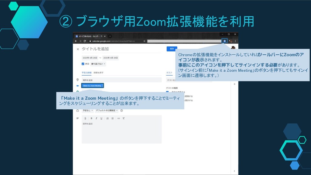 ② ブラウザ用Zoom拡張機能を利用 「Make it a Zoom Meeting」のボタンを押下することでミーティ ングをスケジューリングすることが出来ます。 Chromeの拡張機能をインストールしていれば