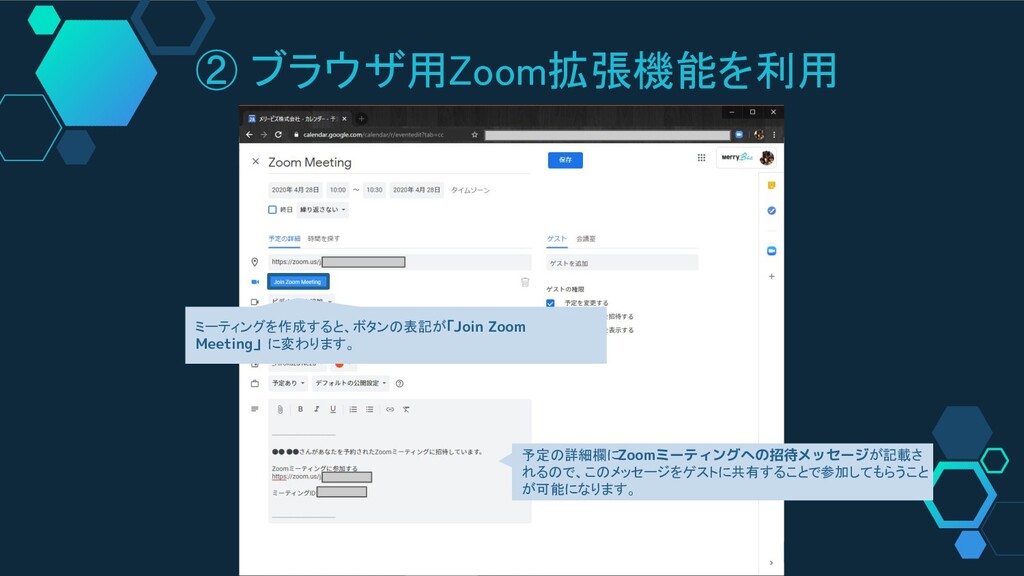 ② ブラウザ用Zoom拡張機能を利用 ミーティングを作成すると、ボタンの表記が 「Join Zoom Meeting」に変わります。 予定の詳細欄にZoomミーティングへの招待メッセージが記載さ れるので、このメッセージをゲストに共有することで参加してもらうこと が可能になります。