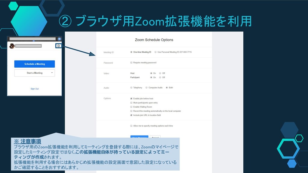 ② ブラウザ用Zoom拡張機能を利用 ※ 注意事項 ブラウザ用のZoom拡張機能を利用してミーティングを登録する際には、Zoomのマイページで 設定したミーティング設定ではなく、 この拡張機能自体が持っている設定によってミー ティングが作成されます。 拡張機能を利用する場合にはあらかじめ拡張機能の設定画面で意図した設定になっている かご確認することをおすすめします。
