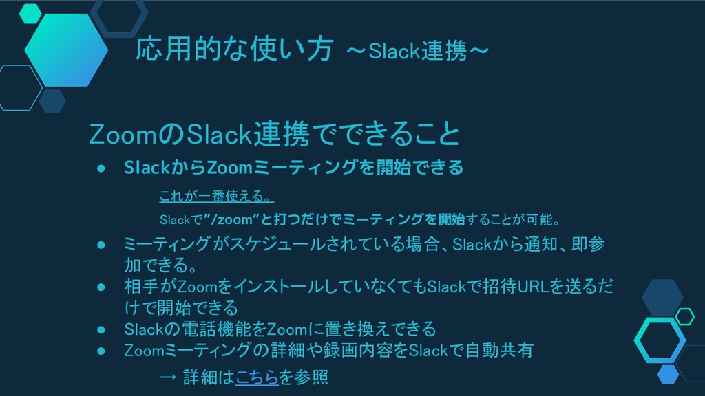 応用的な使い方 ~Slack連携~ ZoomのSlack連携でできること • SlackからZoomミーティングを開始できる これが一番使える。 Slackで”/zoom”と打つだけでミーティングを開始することが可能。 • ミーティングがスケジュールされている場合、Slackから通知、即参 加できる。