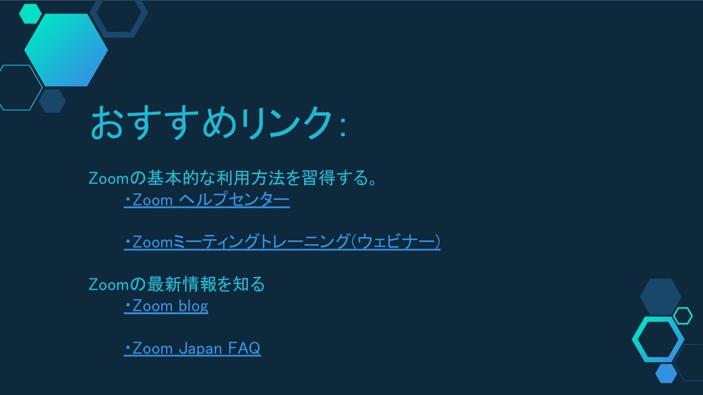 おすすめリンク: Zoomの基本的な利用方法を習得する。 ・Zoom ヘルプセンター ・Zoomミーティングトレーニング(ウェビナー) Zoomの最新情報を知る