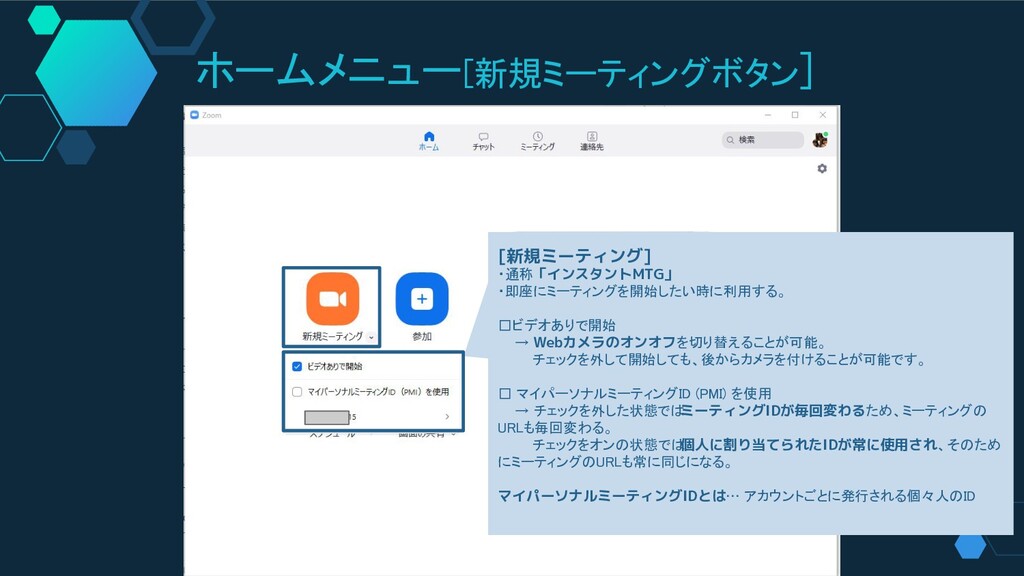 ホームメニュー[新規ミーティングボタン] [新規ミーティング] ・通称「インスタントMTG」 ・即座にミーティングを開始したい時に利用する。 □ビデオありで開始 → Webカメラのオンオフを切り替えることが可能。