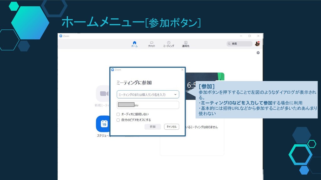 ホームメニュー[参加ボタン] [参加] 参加ボタンを押下することで左図のようなダイアログが表示され る。 ・ミーティングIDなどを入力して参加する場合に利用 ・基本的には招待URLなどから参加することが多いためあんまり 使わない