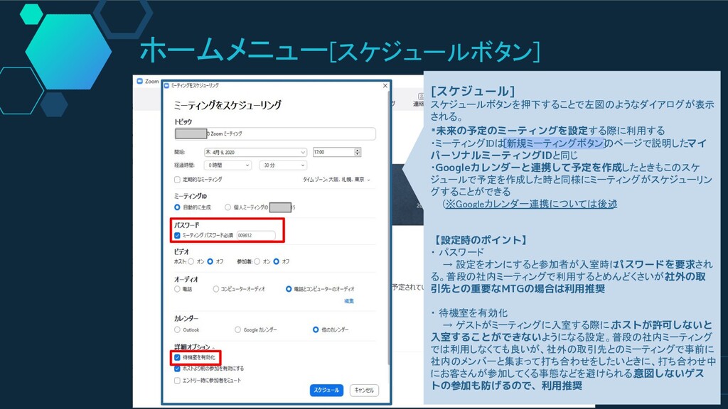 ジュールで予定を作成した時と同様にミーティングがスケジューリン グすることができる (※Googleカレンダー連携については後述 ) 【設定時のポイント】 ・ パスワード → 設定をオンにすると参加者が入室時に パスワードを要求され る。普段の社内ミーティングで利用するとめんどくさいが、 社外の取 引先との重要なMTGの場合は利用推奨 ・ 待機室を有効化 → ゲストがミーティングに入室する際に、 ホストが許可しないと 入室することができないようになる設定。普段の社内ミーティング では利用しなくても良いが、社外の取引先とのミーティングで事前に 社内のメンバーと集まって打ち合わせをしたいときに、打ち合わせ中 にお客さんが参加してくる事態などを避けられる。 意図しないゲス トの参加も防げるので、利用推奨