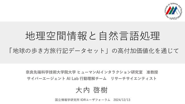 • 地球の歩き方旅行記データセット ◼ 二次データ • ATD-MCL (ジオパージング) • ATD-VSO (訪問グラフ) • ATD-MCL-Overseas (ジオパージング海外旅行記) • ATD-Para(仮) (英語翻訳データ) ◼ ソフトウェア • 場所参照表現抽出モデル • HuggingFace • Google Colab • ジオコーディングモデル • 訪問グラフ予測モデル https://www.nii.ac.jp/dsc/idr/arukikata/ https://www.nii.ac.jp/dsc/idr/arukikata/ https://github.com/naist-nlp/atd-mcl Coming soon! https://github.com/naist-nlp/atd-mcl-overseas https://huggingface.co/naist-nlp/mluke-large-lite-finetuned-atd https://colab.research.google.com/drive/1BI2hxfOzxyT7mET8OzJ7RbF7zFCvqSEo?usp=sharing Coming soon! Coming soon! Coming soon!