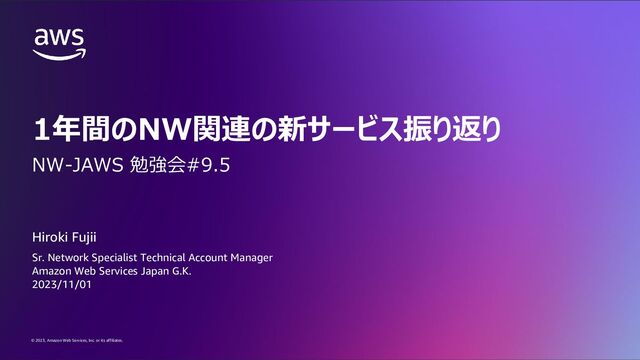 2023, Amazon Web Services, Inc. or its affiliates. 1年間のNW関連の新サービス振り返り NW-JAWS 勉強会#9.5 Hiroki Fujii Sr. Network Specialist Technical Account Manager Amazon Web Services Japan G.K. 2023/11/01