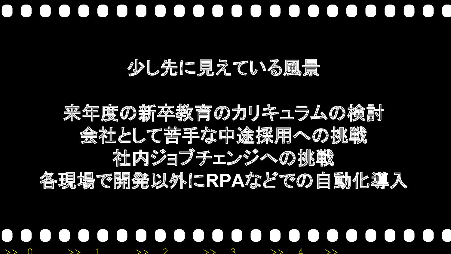 少し先に見えている風景 来年度の新卒教育のカリキュラムの検討 会社として苦手な中途採用への挑戦 社内ジョブチェンジへの挑戦 各現場で開発以外にRPAなどでの自動化導入