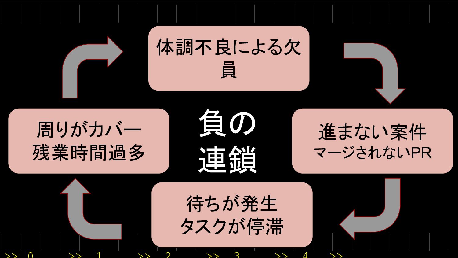 体調不良による欠 員 進まない案件 マージされないPR 周りがカバー 残業時間過多 待ちが発生 タスクが停滞 負の 連鎖
