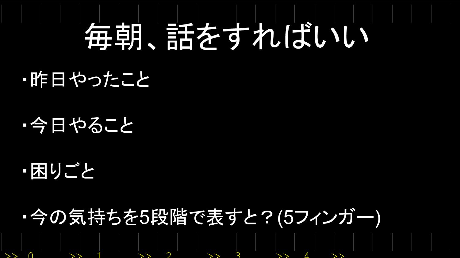 毎朝、話をすればいい ・昨日やったこと ・今日やること ・困りごと ・今の気持ちを5段階で表すと?(5フィンガー)