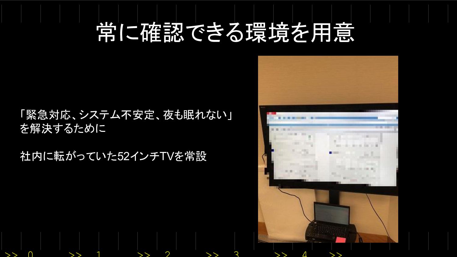 「緊急対応、システム不安定、夜も眠れない」 を解決するために 社内に転がっていた52インチTVを常設 常に確認できる環境を用意