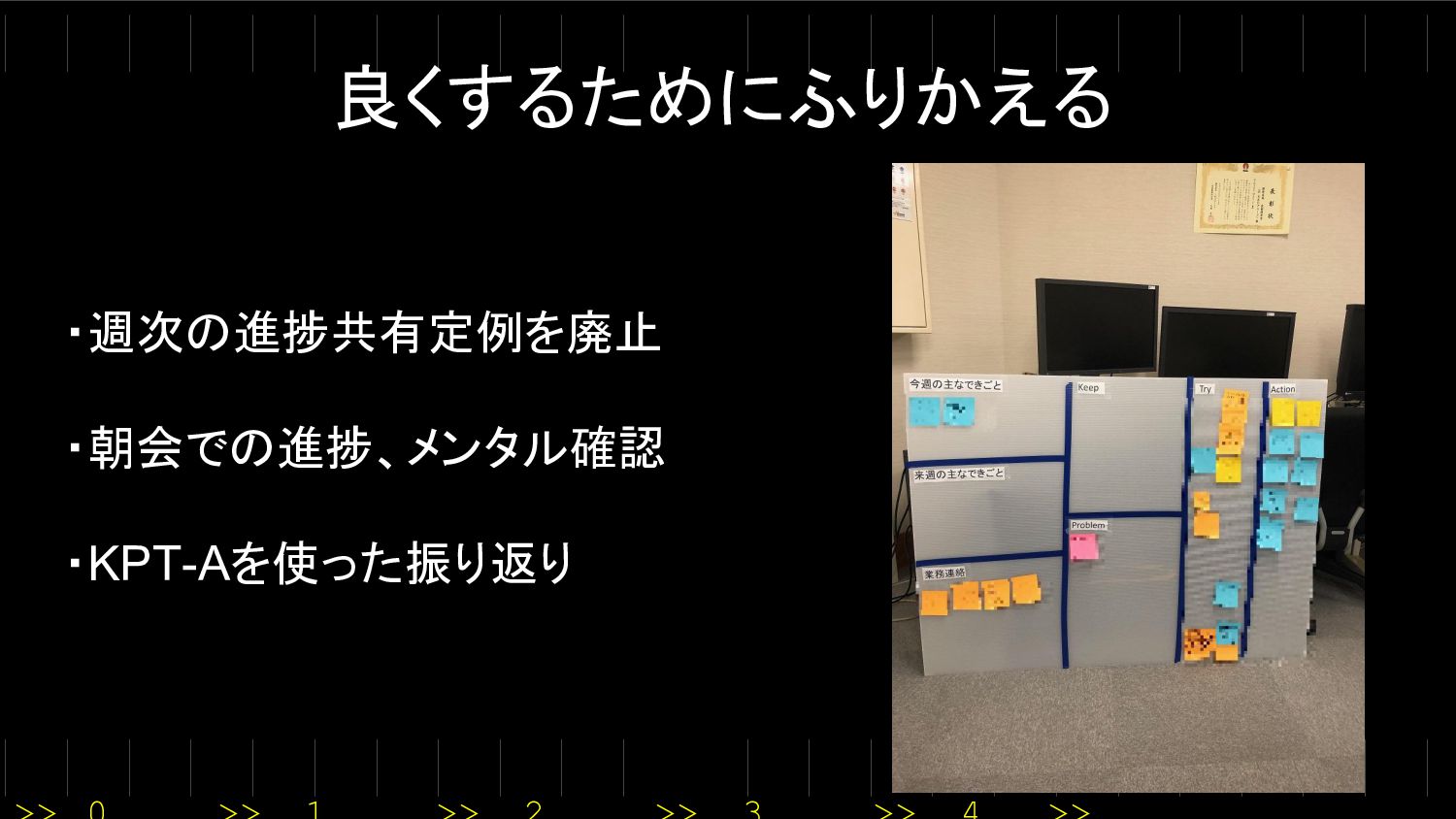 良くするためにふりかえる ・週次の進捗共有定例を廃止 ・朝会での進捗、メンタル確認 ・KPT-Aを使った振り返り