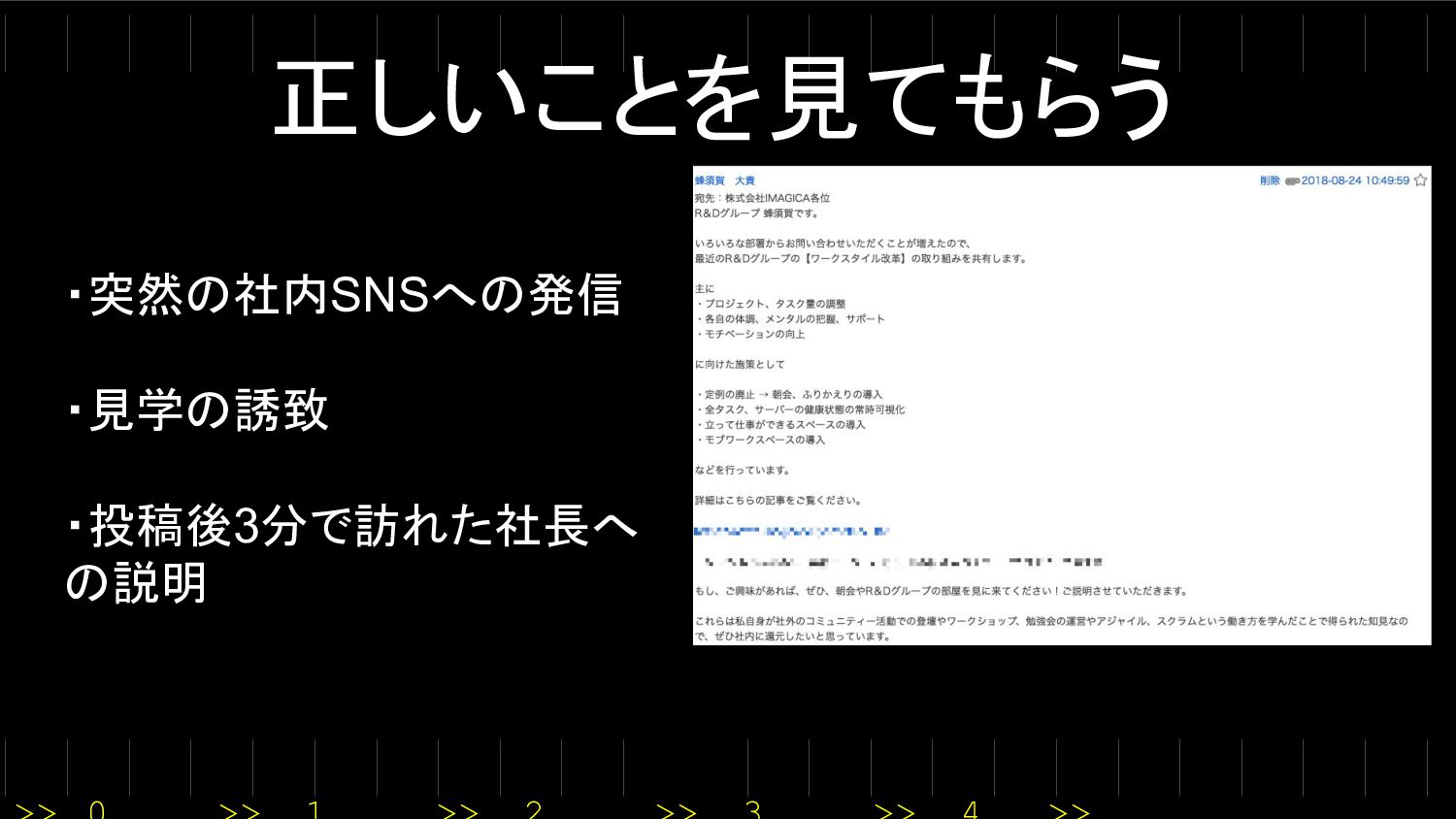 正しいことを見てもらう ・突然の社内SNSへの発信 ・見学の誘致 ・投稿後3分で訪れた社長へ の説明