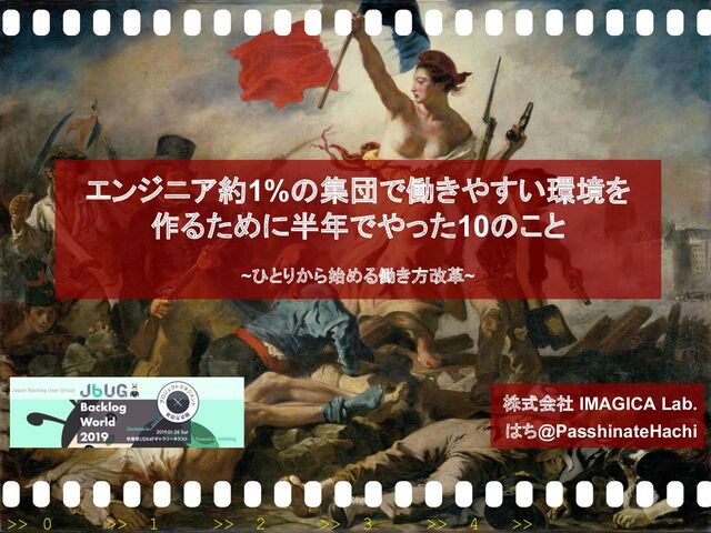 >> エンジニア約1%の集団で働きやすい環境を 作るために半年でやった10のこと ~ひとりから始める働き方改革~ 株式会社 IMAGICA Lab. はち@PasshinateHachi