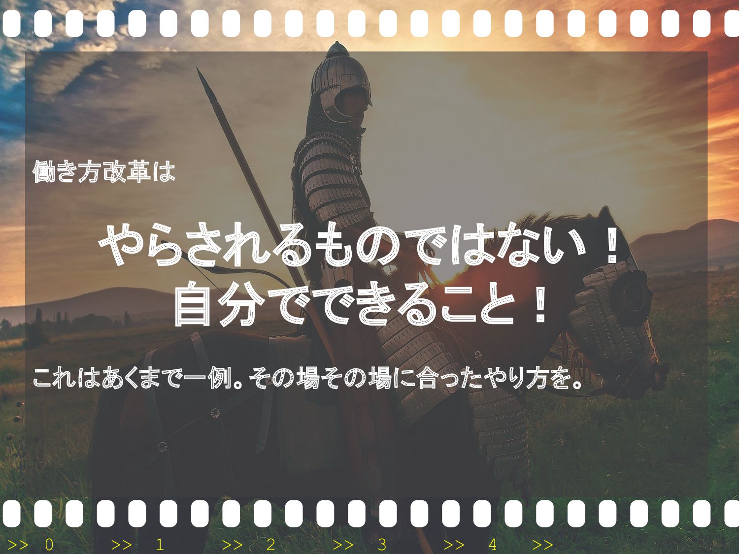 >> 働き方改革は やらされるものではない! 自分でできること! これはあくまで一例。その場その場に合ったやり方を。