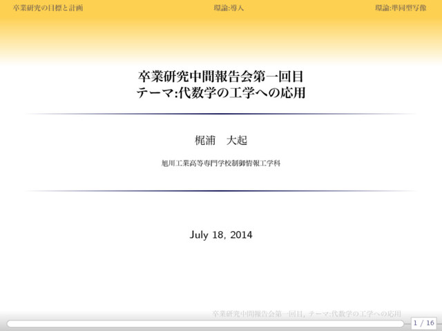 ∗ が定義される集合 R. つまり,たし算,ひき算,かけ算が入っている様な集合 R である. 環の公理 和 + 積 ∗ 計算出来る a + b ∈ R a ∗ b ∈ R 結合法則 (a + b) + c = a + (b + c ) (a ∗ b ) ∗ c = a ∗ (b ∗ c ) 単位元がある 0R + a = a + 0R = a 1R ∗ a = a ∗ 1R = a 逆元がある a + (−a) = (−a) + a = 0R 交換法則 a + b = b + a 分配法則 a ∗ (b + c ) = a ∗ b + a ∗ c a,b,c ,0R ,1R ,−a はそれぞれ R の要素である.0R ,1R は特にそれぞれ 零元,単位元と呼ばれる. 3 / 16 卒業研究中間報告会第一回目, テーマ:代数学の工学への応用