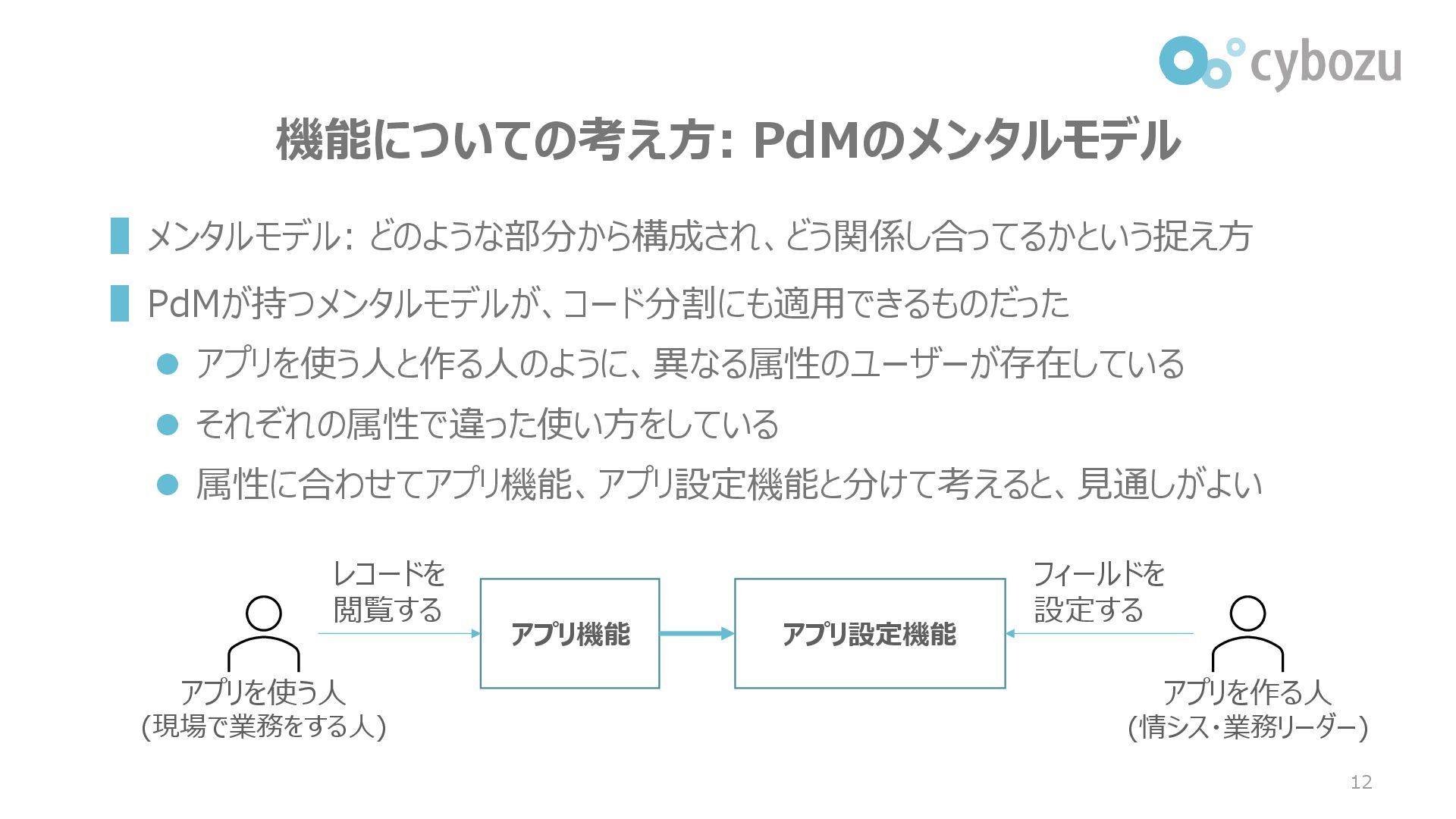 機能についての考え方: PdMのメンタルモデル ▌メンタルモデル: どのような部分から構成され、どう関係し合ってるかという捉え方 ▌PdMが持つメンタルモデルが、コード分割にも適用できるものだった ⚫ アプリを使う人と作る人のように、異なる属性のユーザーが存在している ⚫ それぞれの属性で違った使い方をしている ⚫