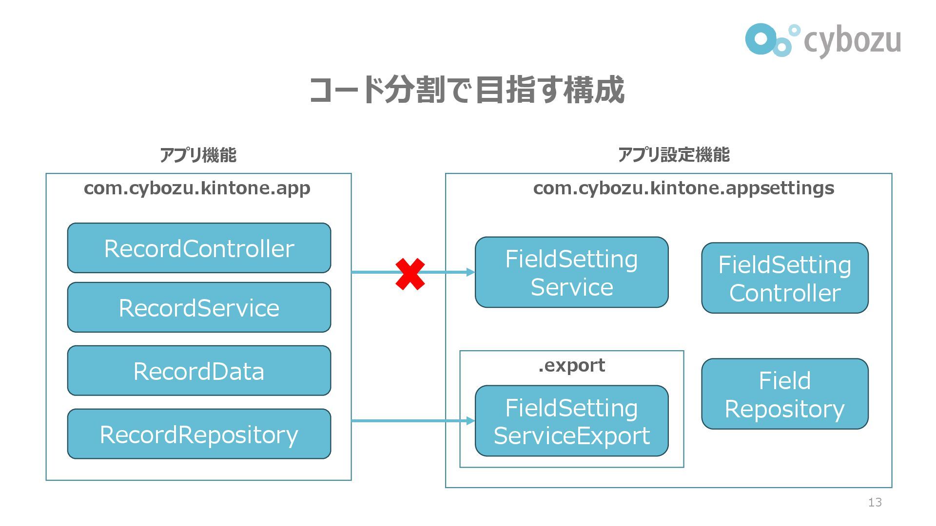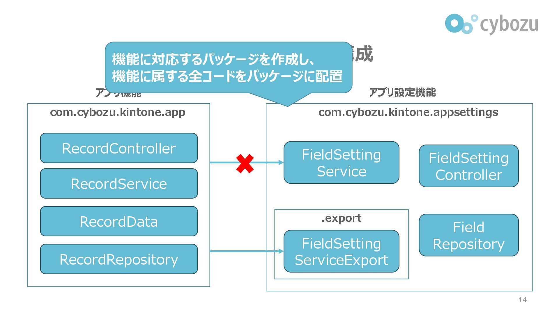 コード分割で目指す構成 13 com.cybozu.kintone.appsettings アプリ機能 アプリ設定機能 com.cybozu.kintone.app FieldSetting Controller FieldSetting Service