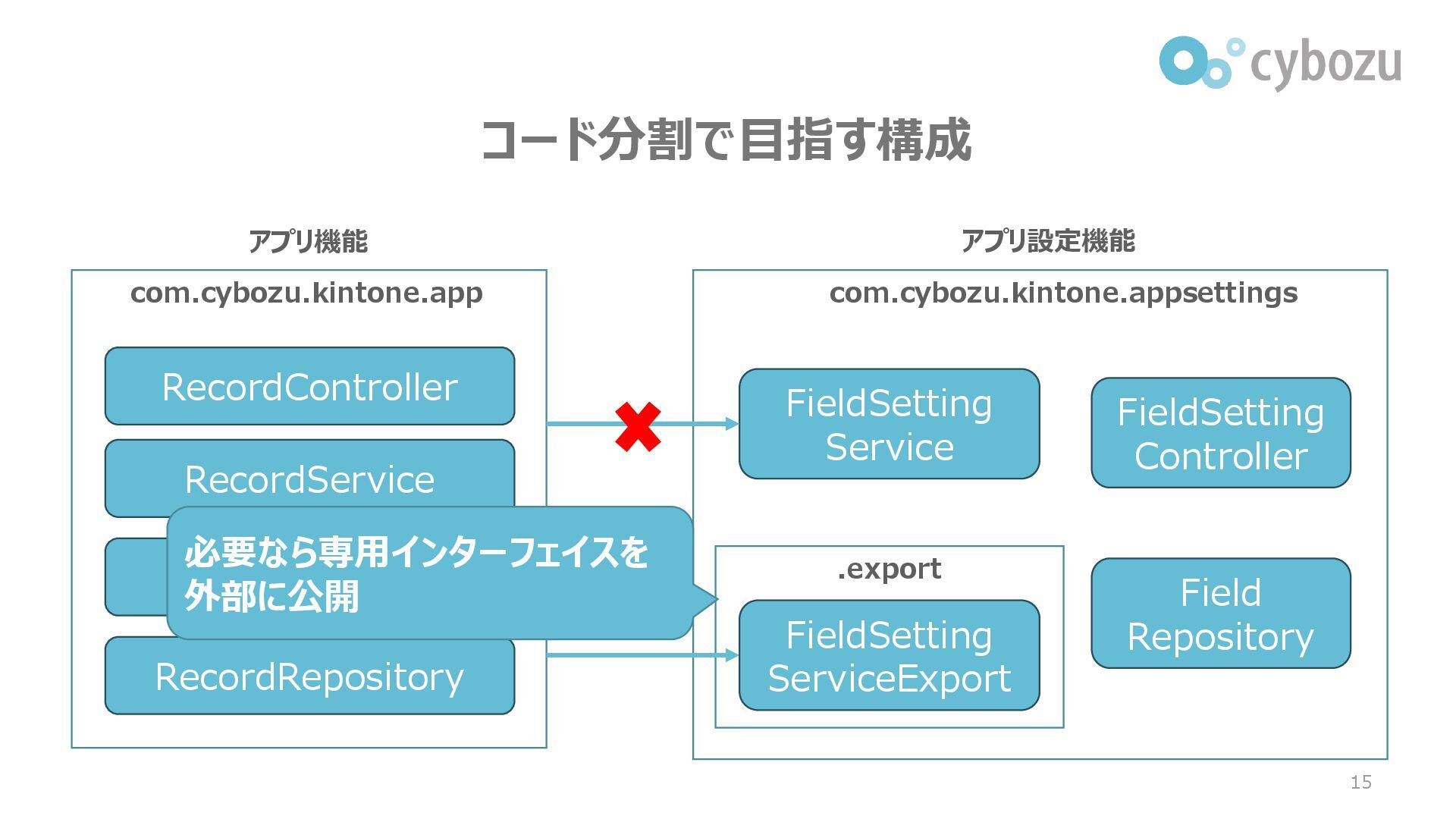 コード分割で目指す構成 14 com.cybozu.kintone.appsettings アプリ機能 アプリ設定機能 com.cybozu.kintone.app FieldSetting Controller FieldSetting Service